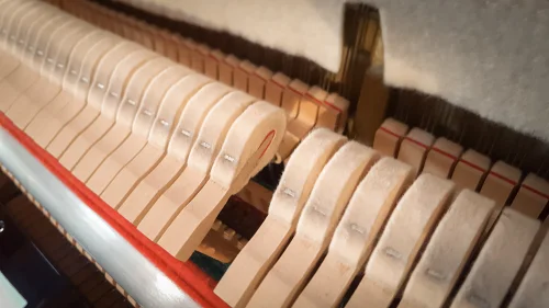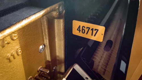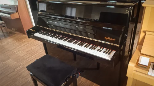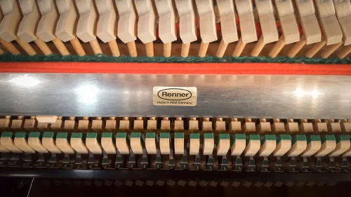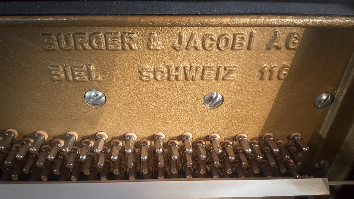 Stattliches Klavier in schwarz poliert von 1982, ähnlich den College-Modellen von Grotrian-Steinweg ein höheres Studio-Klavier mit angedeuteten Konsolen. Weiterhin gemeinsam mit Grotrian ist den Schweizer Klavierbauern ein sehr hoher Anspruch: das Klavier aus Biel ist Instrumentenbau vom Feinsten! Natürlich mit RENNER-Mechanik mit sehr großen Hämmern ausgestattet läßt ein Blick auf so ein unscheinbares Bauteil wie den Moderator das Klavierbauerherz höher schlagen: dort ist ein textiles Gewebeband an die Moderatorleiste geklebt, welches wiederum an den Moderatorfilz genäht ist. Dadurch hängt der Filz immer senkrecht nach unten und verhakt sich nicht mit den Stimmwirbeln, was bei anderen Fabrikaten oft genug passiert.