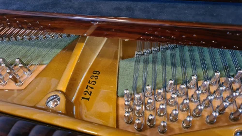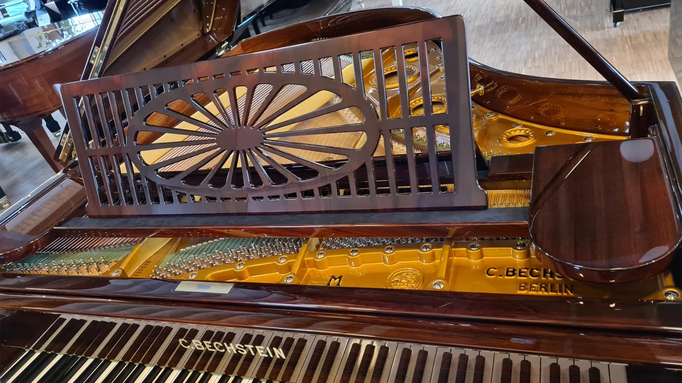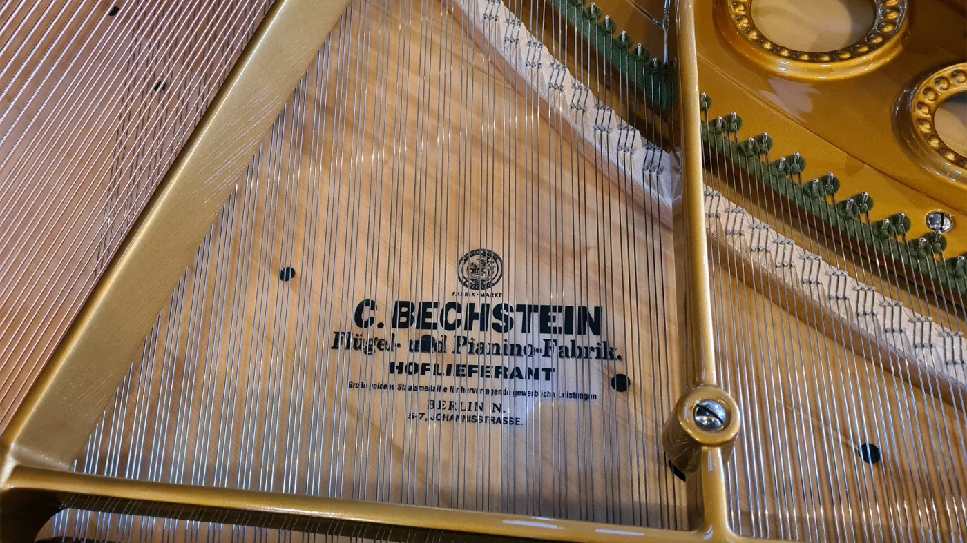 Die originalen Hämmer wurden mit Abel-Premium Filz neu befilzt, die Hammerrollen in Echtleder erneuert. Das Klangbild ist sanft, feingliedrig, licht und hell und zeigt deutlich, warum Bechstein einst eine der ganz großen Marken war.
