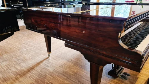 Wunderschöner Bechstein von 1926 in seltenem und sehr dekorativem Palisander poliert. Der Flügel wurde komplett neu aufgebaut mit neuem Stimmstock, neuen Stegdoppeln, Resonanzbodenreparatur, Neubesaitung/Bewirbelung und Neulackierung der Gussplatte. Der erstklassig erhaltend originale Tastenbelag wurde poliert, das sämisch gegerbte Klaviaturleder mit Klauenöl regeneriert, so dass es wahrscheinlich nochmal 100 Jahre lang funktioniert.