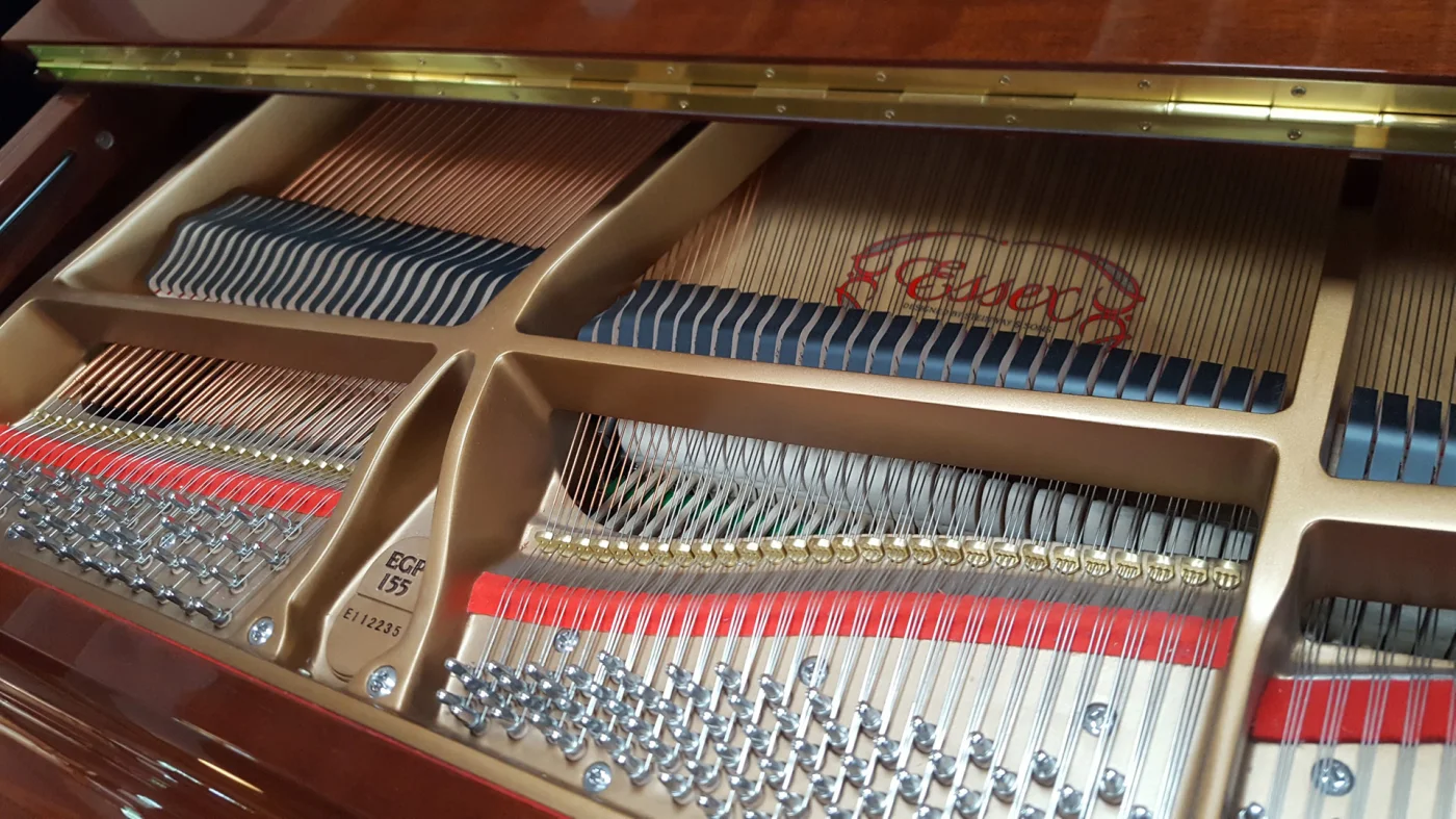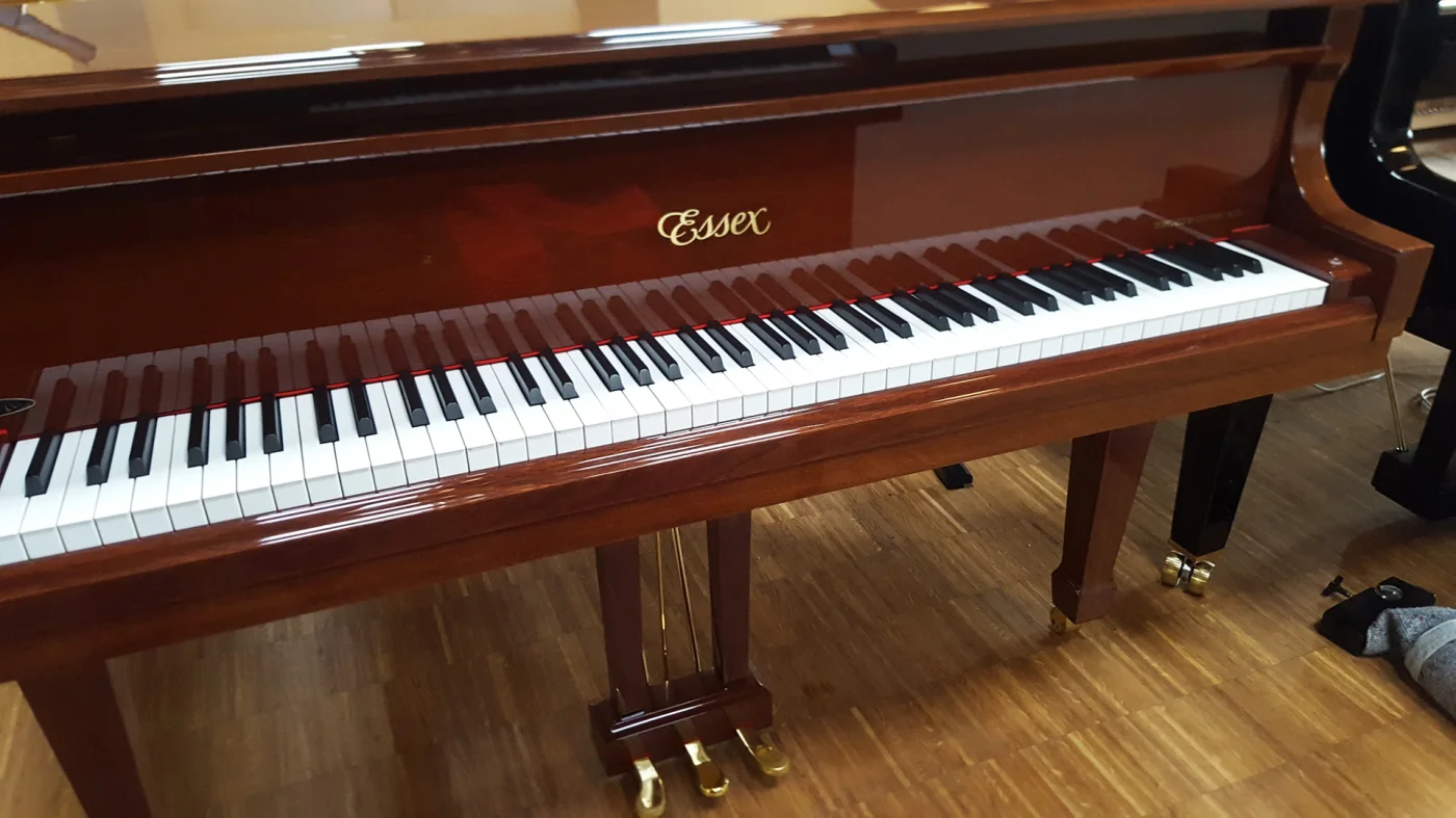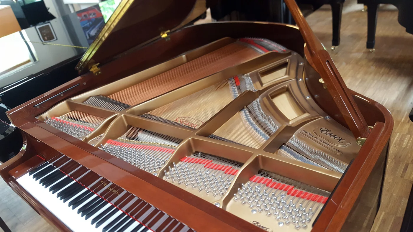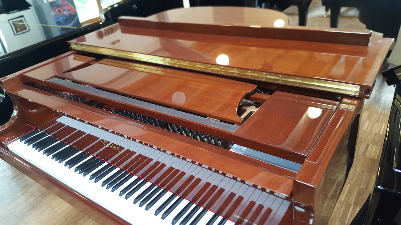 Kleiner Flügel in Mahagoni poliert aus Inzahlungnahme. Aktuell bekam das Instrument bei uns eine Überholung der Mechanik mit Abziehen der Hämmer und einer kompletten Ausarbeitung und Regulation. Wer einen Flügel sucht, der nicht schwarz sein soll, bekommt hier einen ordentlichen Gegenwert für sein Geld!