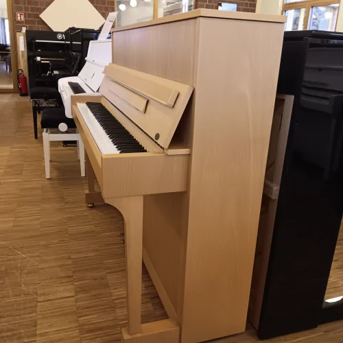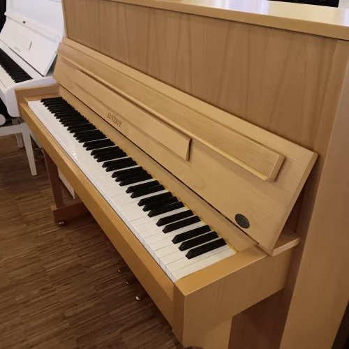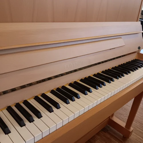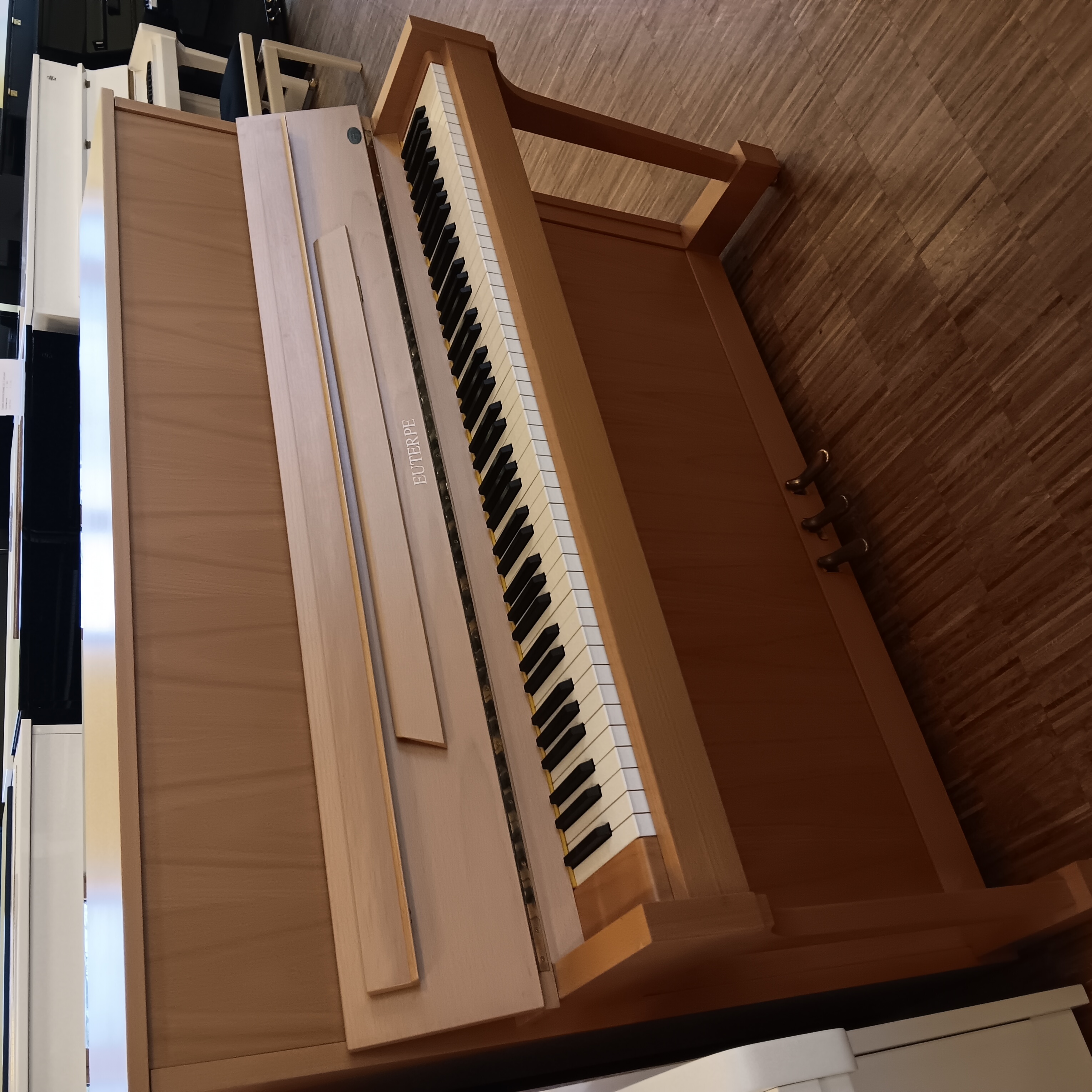 Zeitloses Design in Buche-das Euterpe 120, welches wir Ihnen vorstellen möchten, stammt aus dem Jahr 2000. Das schöne Konsolenklavier markierte im Bechstein-Portfolio dieser Zeit die gehobene Eistiegs- bzw. untere Mittelklasse. Da es bei Petrof gebaut wurde und im wesentlichen auf leicht modifizierten Konstruktion des 118er Rastens von Petrof beruht, beschreibt man den Klang am besten als “hell intoniertes Petrof”.