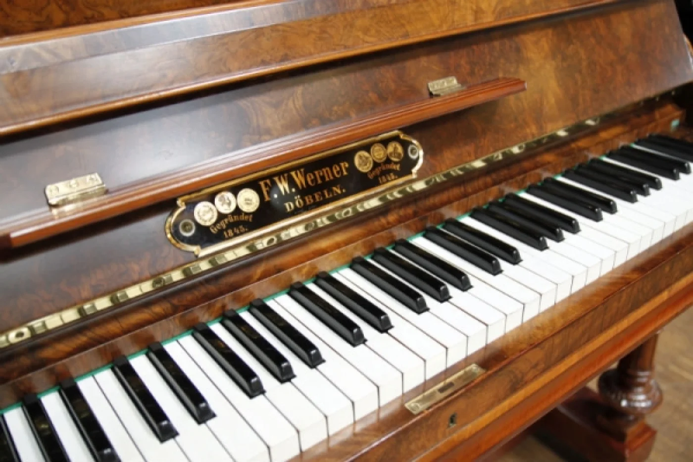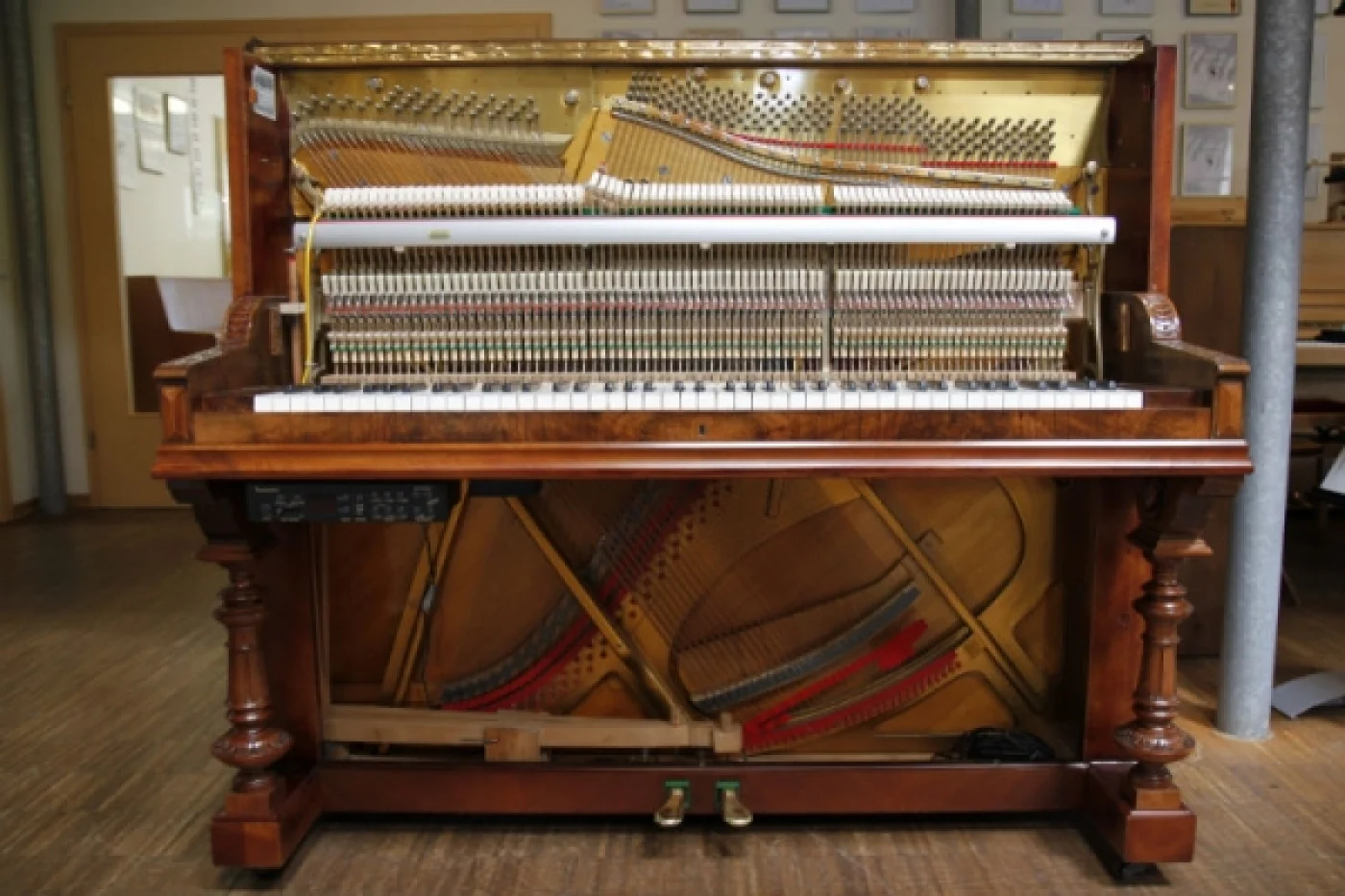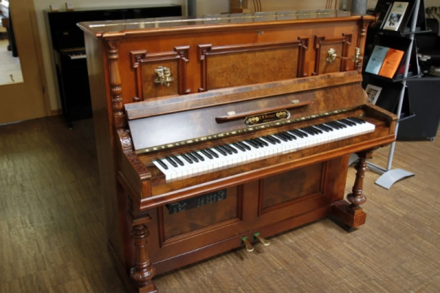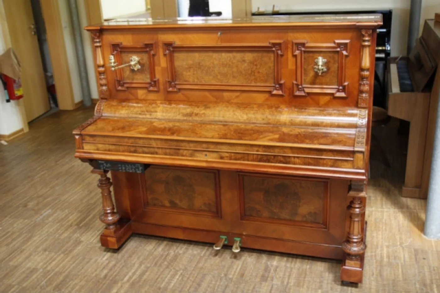 Altes, vor ca. 20 Jahren generalüberholtes Konzertklavier in Nussbaum/Nussbaum-Wurzel. Neue Stimmwirbel, neue Blanksaiten mit Resonanzbodenreparatur, neue! RENNER-Mechanik, hochwertige Repro-Leuchter.