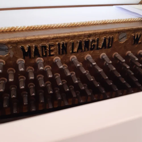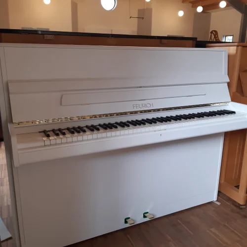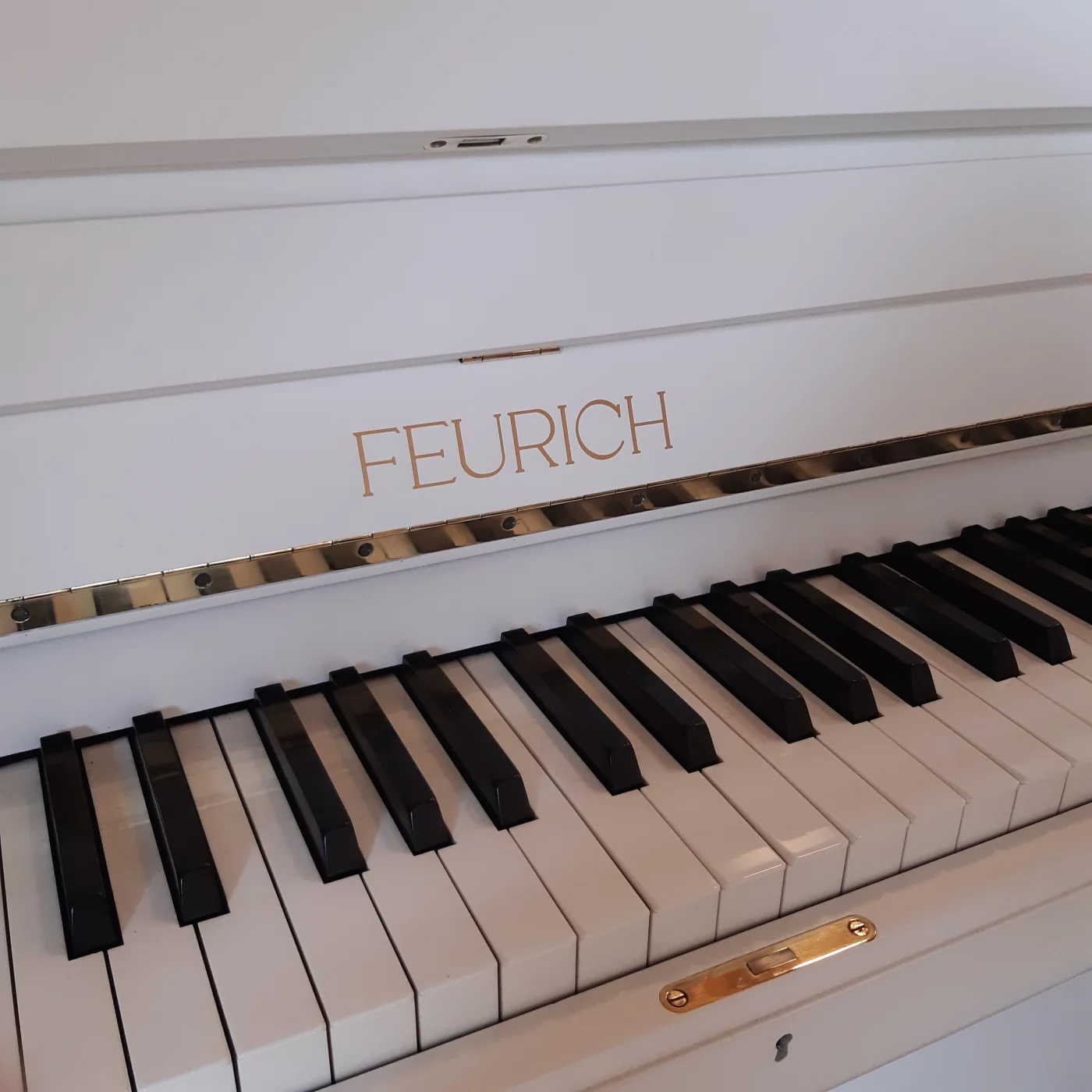 Feurich-Klavier aus der guten Langlauer Epoche in aufwendig hergestelltem Überholungszustand. Schon am Gehäuse sieht man, daß man sich in der gehobenen Klasse bewegt: zwar typisch eigentlich konsolenlos, doch die angedeuten Konsolen geben dem Gehäuse doch deutlich mehr Massivität als bei den ganz sparsamen Varianten dieser Zeit üblich. Und 114 cm ist nicht so klein, der Tiefbass sucht in dieser Bauhöhe seinesgleichen! Eine neue Oberfläche in weiß mattiert mit Überholung der Messingbeschläge macht dieses Klavier kombinierbar mit den unterschiedlichsten Einrichtungsstilen.