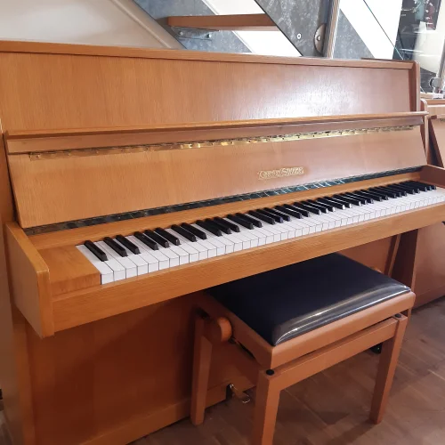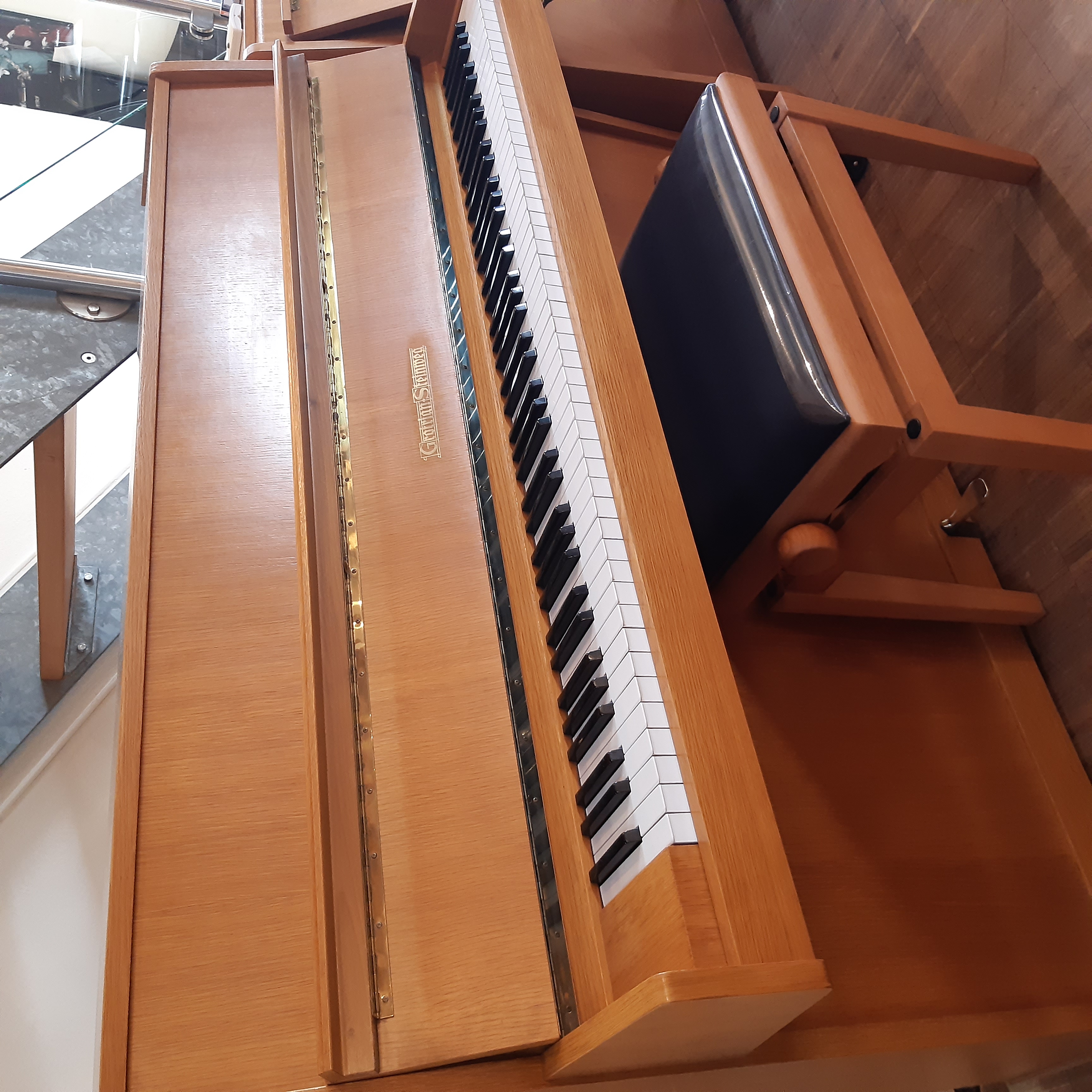 Richtig gutes Klavier mit kleiner Bauhöhe. Aus erster Hand, immer gepflegt. Aktuell bekam das Instrument eine große Mechanikinspektion und komplett neue Klaviaturgarnierungen. Obligat sind eine gute Ausarbeitung mit Regulation und Intonation.