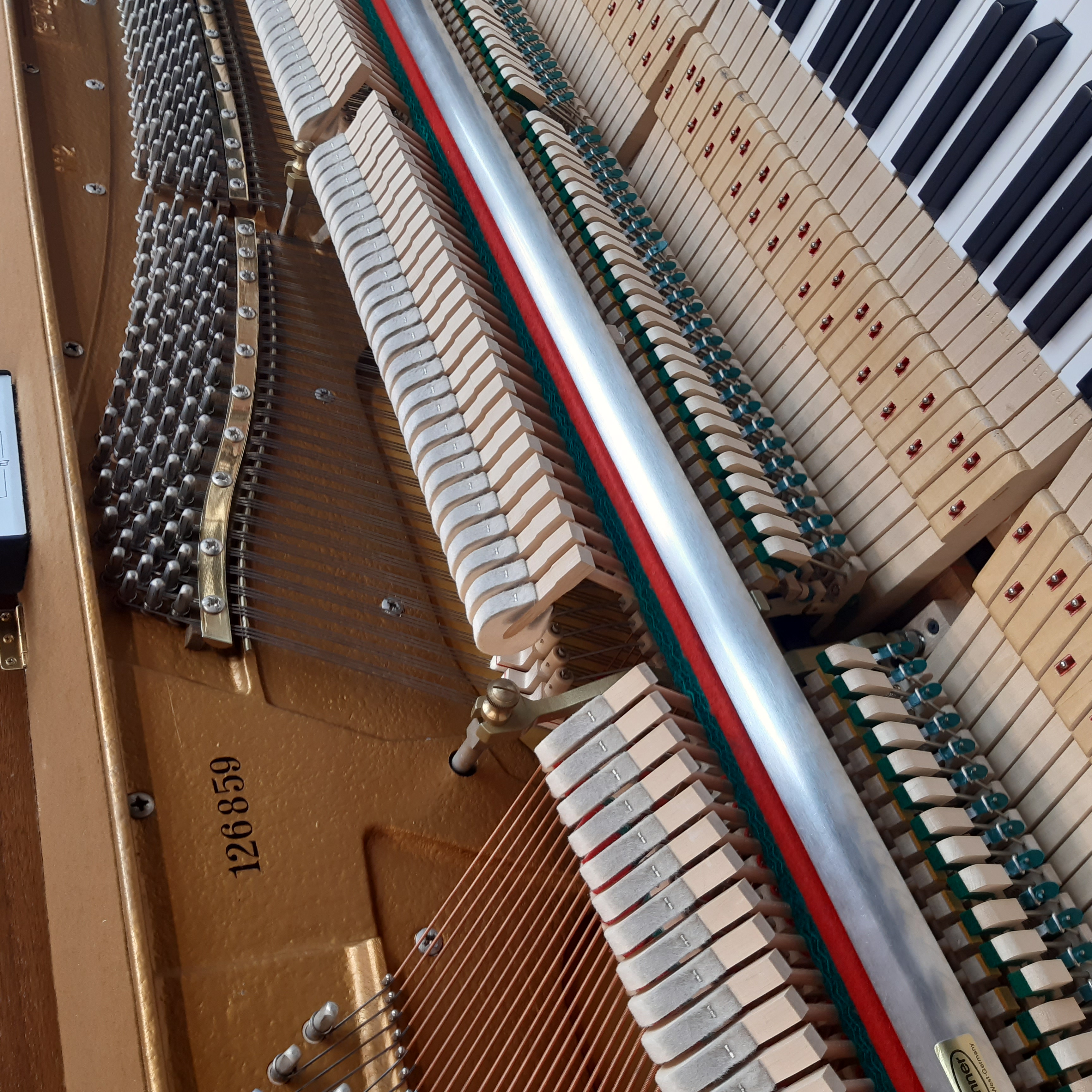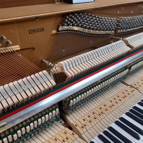 Schönes Klavier in Studioform in gediegenem Nussbaum. Aus erster Hand und mäßig genutzt hat das Klavier alle Stationen unserer Meisterwerkstatt durchlaufen: große Mechanikinspektion mit Abziehen der Hammerköpfe, kompletter Rgulation von Klaviatur und Mechanik und moderater Aufbereitung des gepflegten Gehäuses.