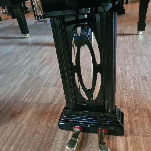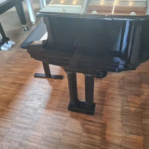 Sehr aufwendig konstruierter kleiner Flügel in schwarz poliert. Das Instrument wurde in allen Baugruppen neu aufgebaut: Resonanzbodenreparatur, Neubesaitung- und bewirbelung, neuer Stimmstock, Gussplatte neu lackiert, neue Oberfläche, neue Hammerfilze und -rollen u.v.m.