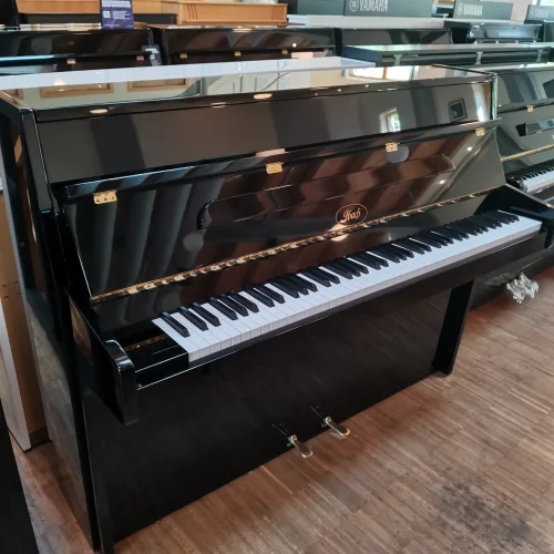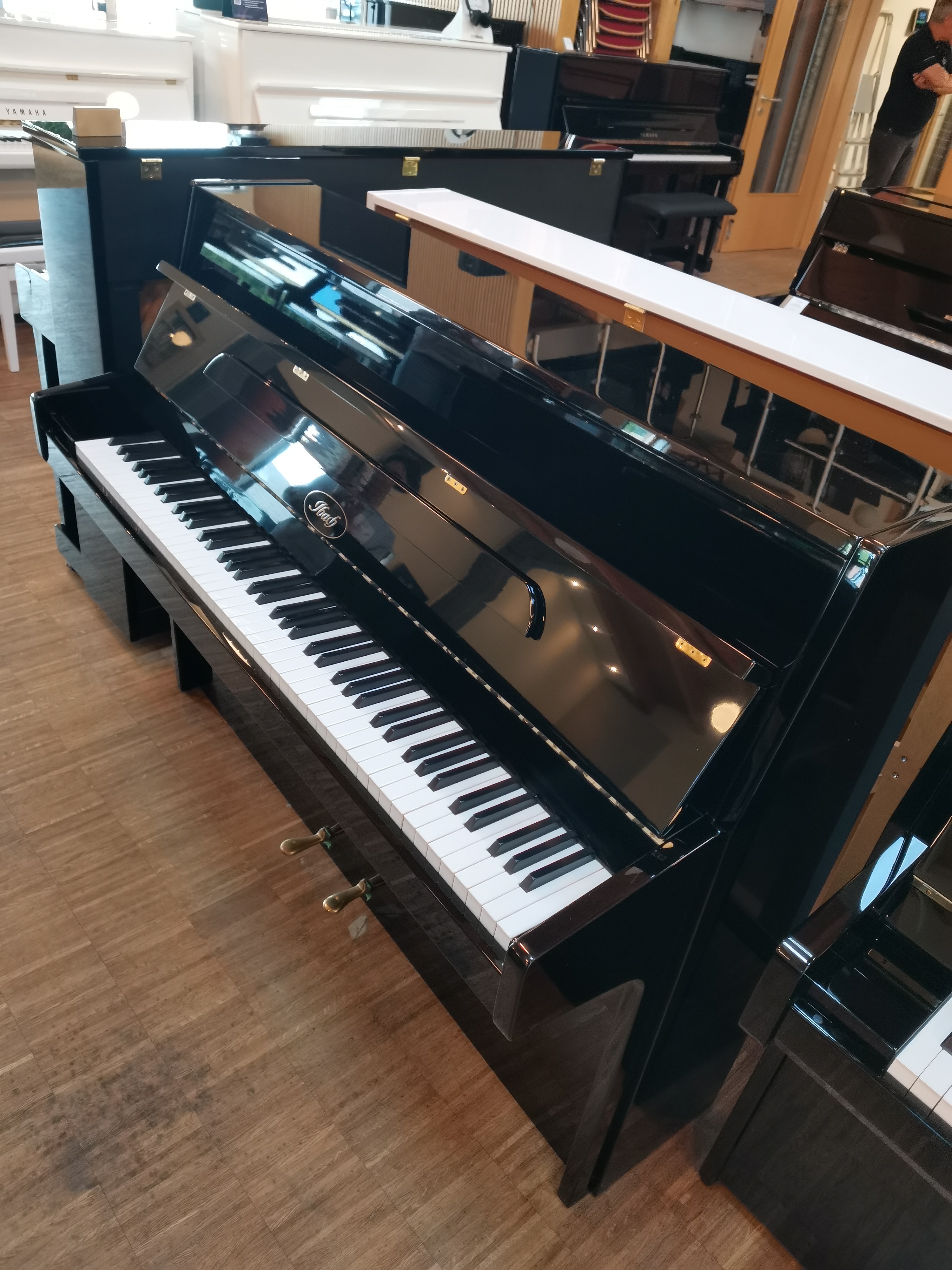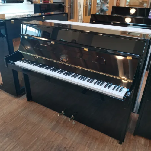 Mittleres Studioklavier, so könnte man dieses 112er Instrument nennen. Dem Kleinklavier entwachsen hat es deutlich "solistische" Qualitäten. Die schöne, sehr gepflegte Oberfläche in schwarz poliert tut ein übriges, um jegliche Assoziation an die Nussbaum-Ära im Keim zu ersticken. Bereits kerniger Tiefbass, klangvolle, offene Intonation. Das Klavier stammt von einer alten Dame, die es leider ins betreute Wohnen nicht mitnehmen konnte. Ein geliebtes Instrument, was in unserer Meisterwerkstatt eine technische Überholung in allen Komponenten erhält.