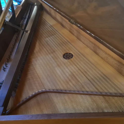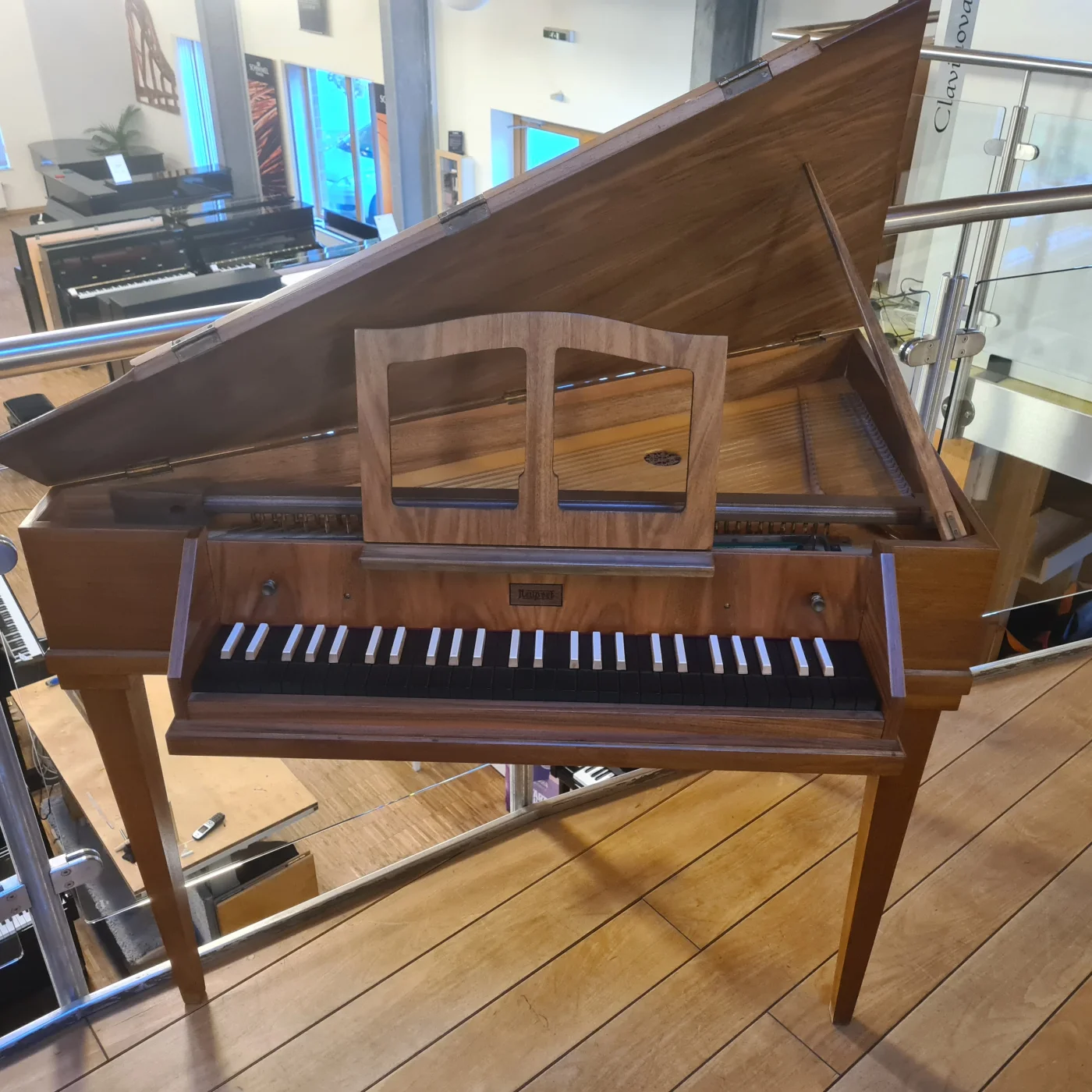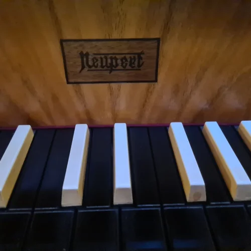 Sympathisches kleines Instrument, welches wir aus einer Haushaltsauflösung bekommen haben. Das Instrument wurde 1954 im Bamberg gebaut und stammt somit aus einer Zeit, in der bürgerliche Kreise entweder Klavier spielten oder aber sich für Barockmusik interessierten und ein Cembalo ihr Eigen nannten. Oder auch beides. Die kleine, platzsparende Variante des Cembalos war dann das Spinett mit einem 8`Register und Lautenzug, Tonumfang C-f```. Das Instrument ist völlig intakt und wurde in unserer Meisterwerksatt behutsam aufgearbeitet mit reinigen, durcharbeiten, regulieren und stimmen.