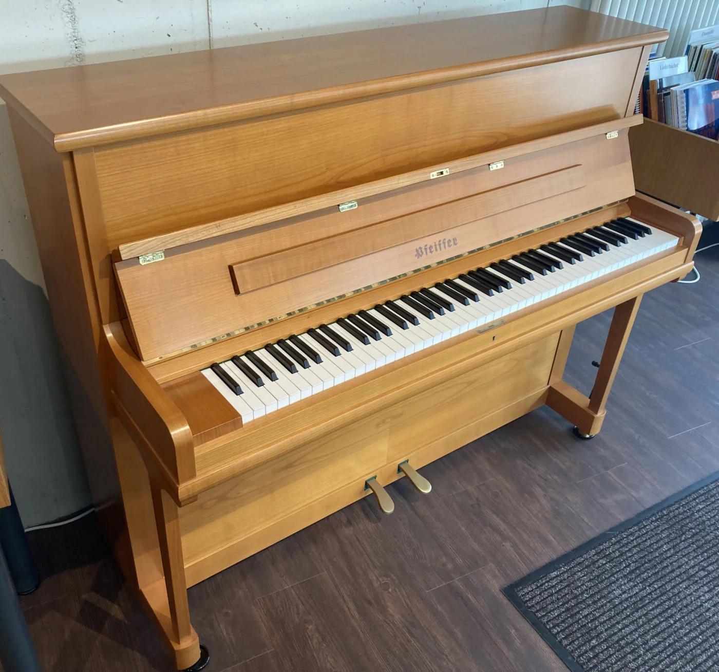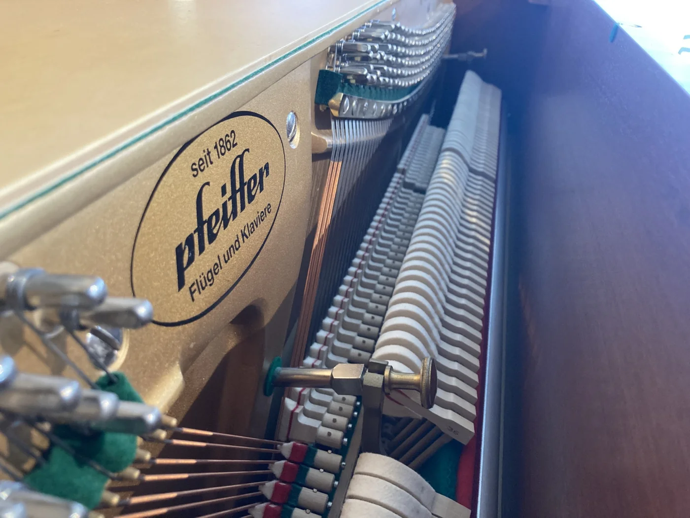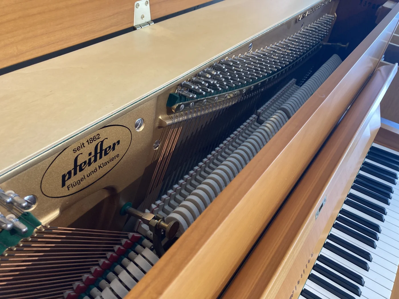 Pfeiffer baut feine Klaviere, das weiß man in der Branche. Dieses hier ist ein besonders schönes : 1992 in einen gepflegten Haushalt verkauft präsentiert es sich in einem, Verzeihung, Jahreswagenzustand, wenn der Begriff hier einmal erlaubt ist. Natürlich haben wir eine Mechanikinspektion durchgeführt und alle Reguliermaße wieder auf Werksniveau eingestellt. Und gestimmt und intoniert. Aber ein Klavier nach 30 Jahren ohne jede Beschädigung und ohne jede Lichtkante vorzufinden, hat schon Seltenheitswert.