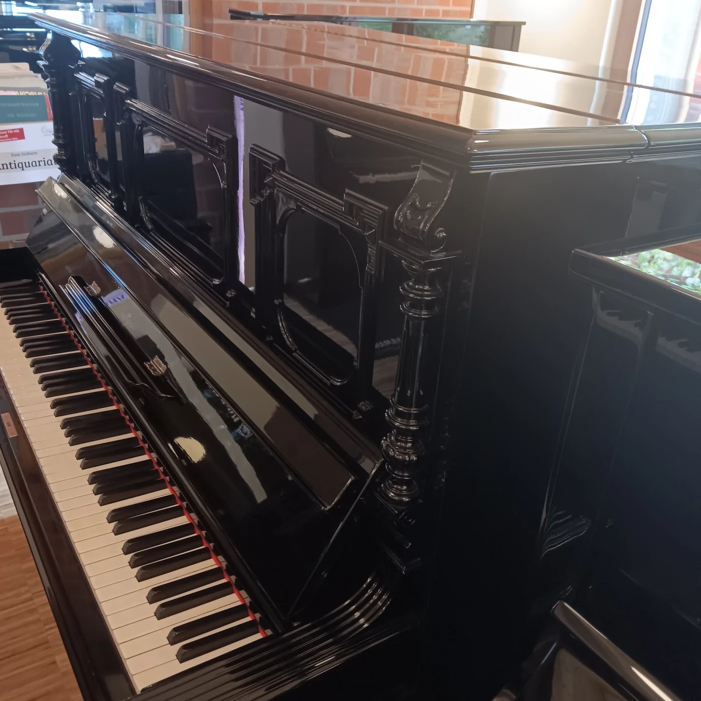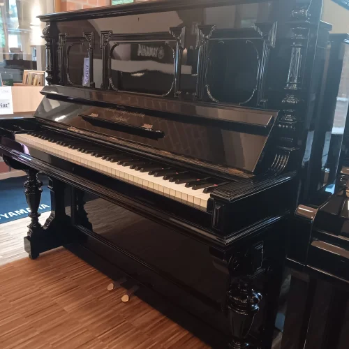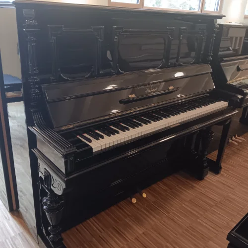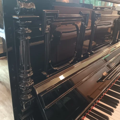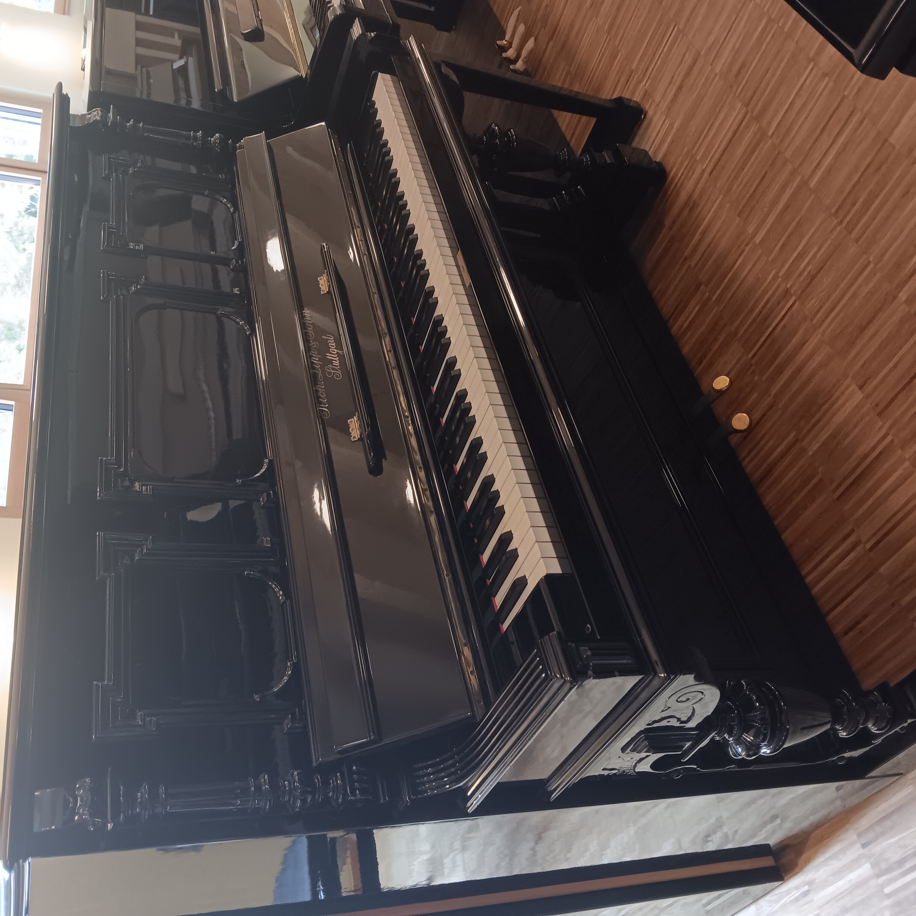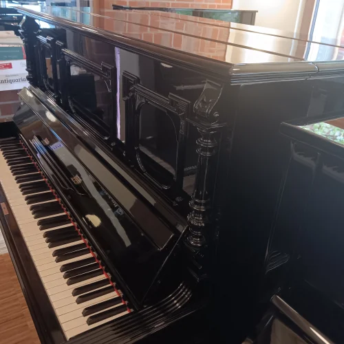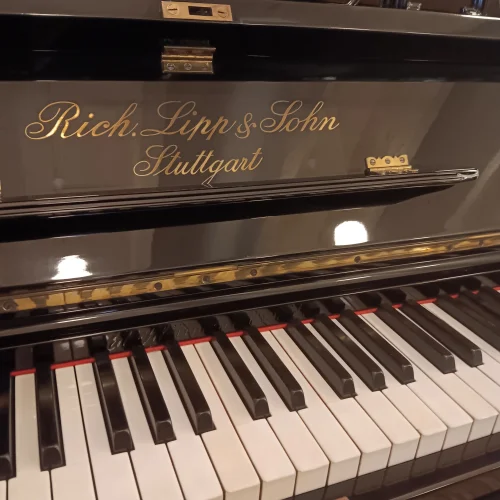 Schön verziertes, ehrwürdiges Klavier in schwarz poliert aus Stuttgarter Produktion. Natürlich mit Unterdämpfung, Kreuzbesaitung und voller Gussplatte. Das Instrument wurde in den 1990er Jahren einmal komplett von einem Klavierbaumeister generalüberholt . Mangels Nutzung gelangte es in unseren Bestand und bekommt nun eine frische Wartung mit Neubefilzung der Hammerköpfe, durchachsen der Mechanik und allem, was dazu gehört. Einer Nutzung über weitere Jahrzehnte steht aus unserer Sicht nach Abschluss unserer Arbeiten nichts im Weg, alle relevanten Bauteile sind entweder erneuert oder gut in Schuß. Mit frischer Regulation und neuen Abel-Naturfilzen auf den Hammerköpfen sollte dieses Klavier von Richard Lipp auch intensiverer Beanspruchung in der Zukunft standhalten, gute Aufstellungsbedinbgungen mit angemessener Luftfeuchtigkeit vorausgesetzt.