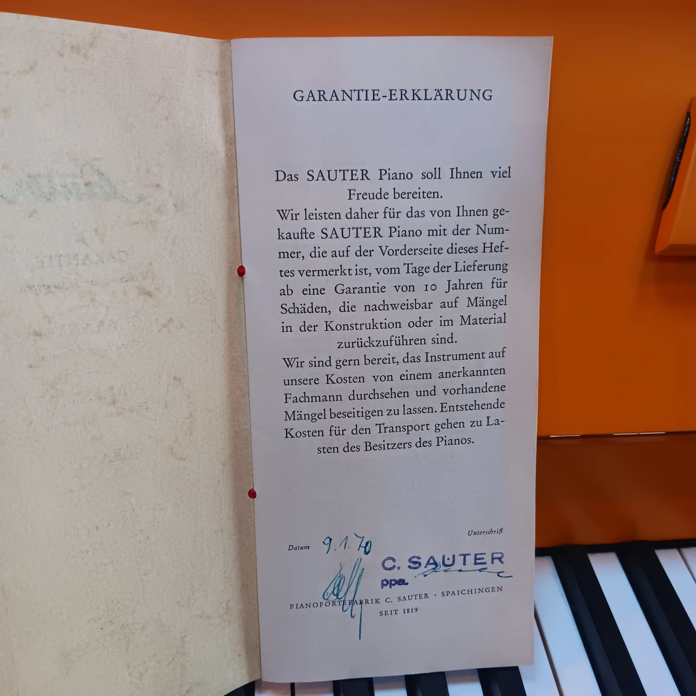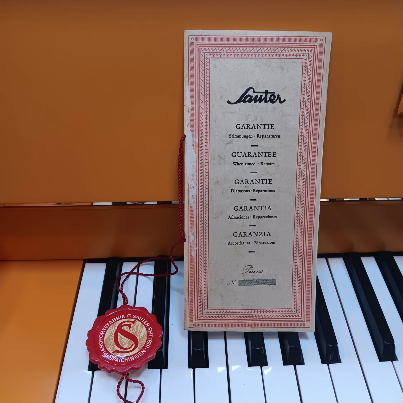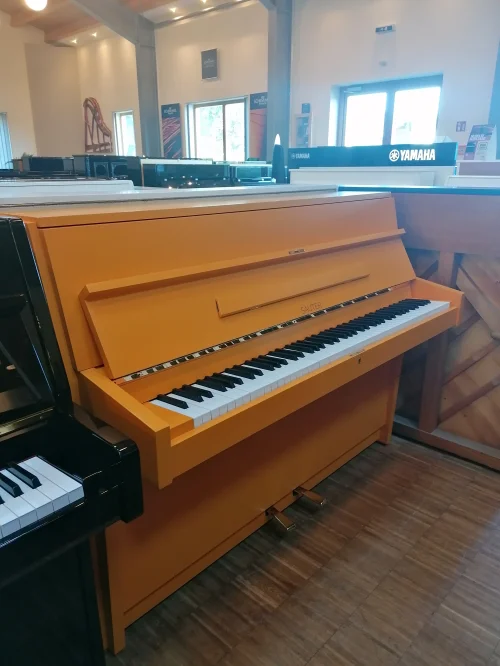 Gutes Kleinklavier! Als Inzahlungnahme für einen Flügel haben wir dieses Instrument bekommen und liebevoll überholt: große Mechanikinspektion der RENNER-Mechanik, neue Klaviaturgarnierungen, minutiöse Ausarbeitung und eine komplett neue Oberfläche in AquaLack-Qualität in Narzissengelb seidenmatt. Man beachte den originalen Garantieschein vom 09.01.1970, keine Selbstverständlichkeit, dass dieser aufbewahrt wurde...