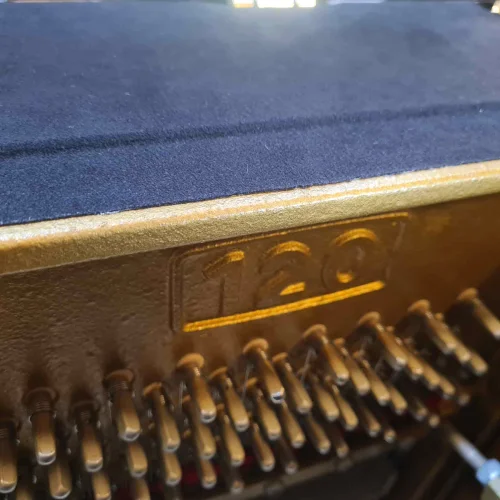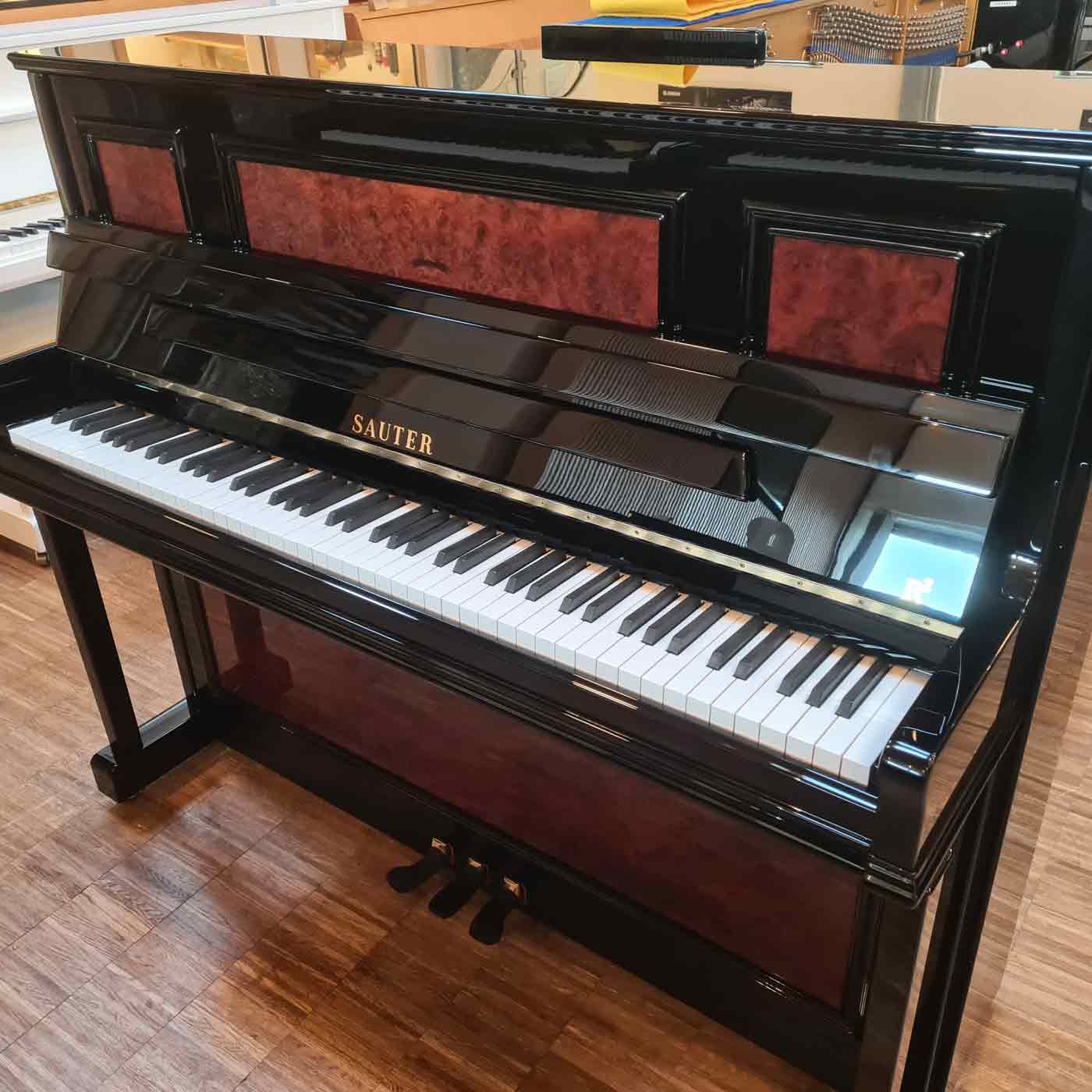 Imposantes Stilklavier von 1986 mit RENNER R ² - Mechanik. Das Klavier hat aufwendige Wurzelnussfüllungen im Obrrahmen, der Unterrahmen ist komplett so furniert. In der Landschaft sachlicher schwarz oder weiß polierter, einander recht ähnlicher Gehäuse ist das mal ein Einzelstück mit echtem Alleinstellungsmerkmal. Selbstverständlich ist das schöne Gehäuse nicht die einzige Qualität, mit der unser SAUTER 120 aufwartet: mit großer Mechanikinspektion und sensibler Eistellung der R² - Repetitionsfeder ergibt sich ein Repetitionsverhalten fast wie beim Flügel-fast. Aber schön ist es schon, die Taste zum Wiederanschlag nicht komplett loslassen zu müssen. Probieren Sie es aus! Ein richtig solides Markenklavier made in Germany!