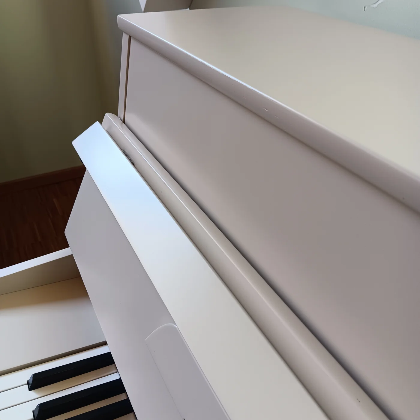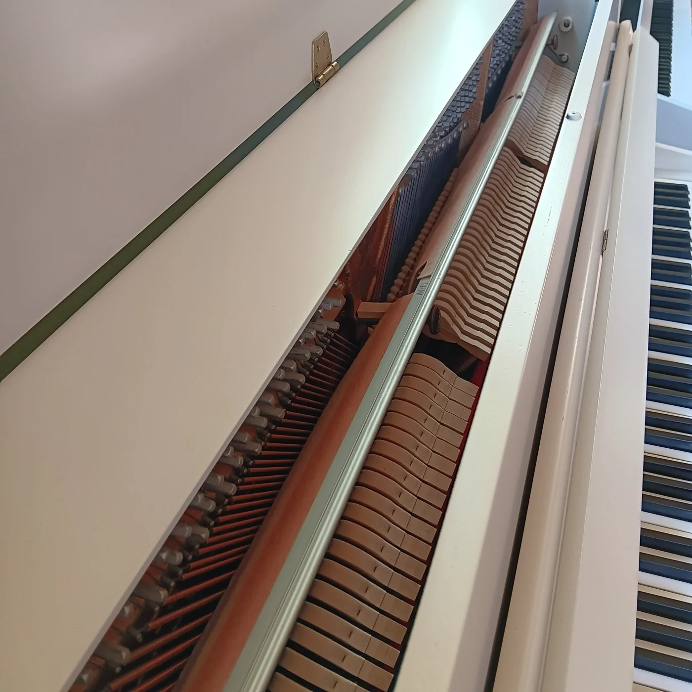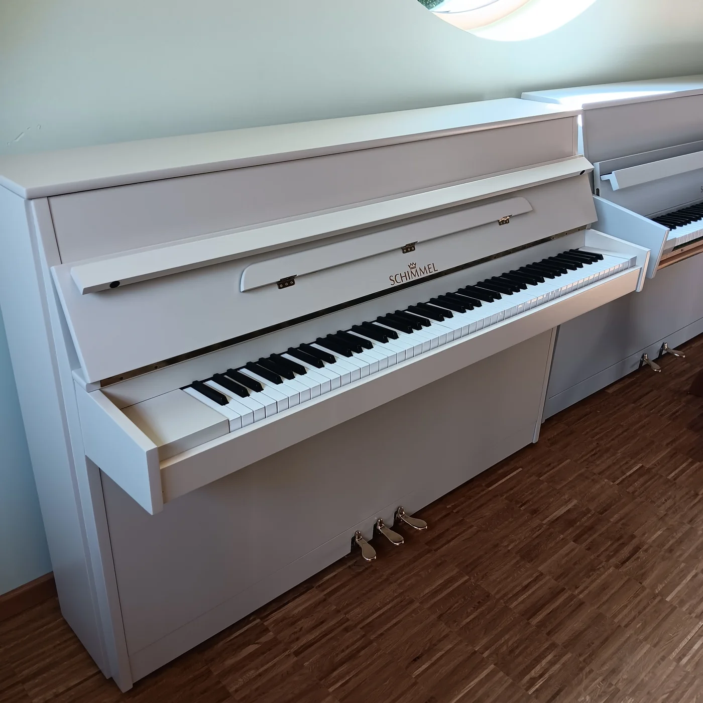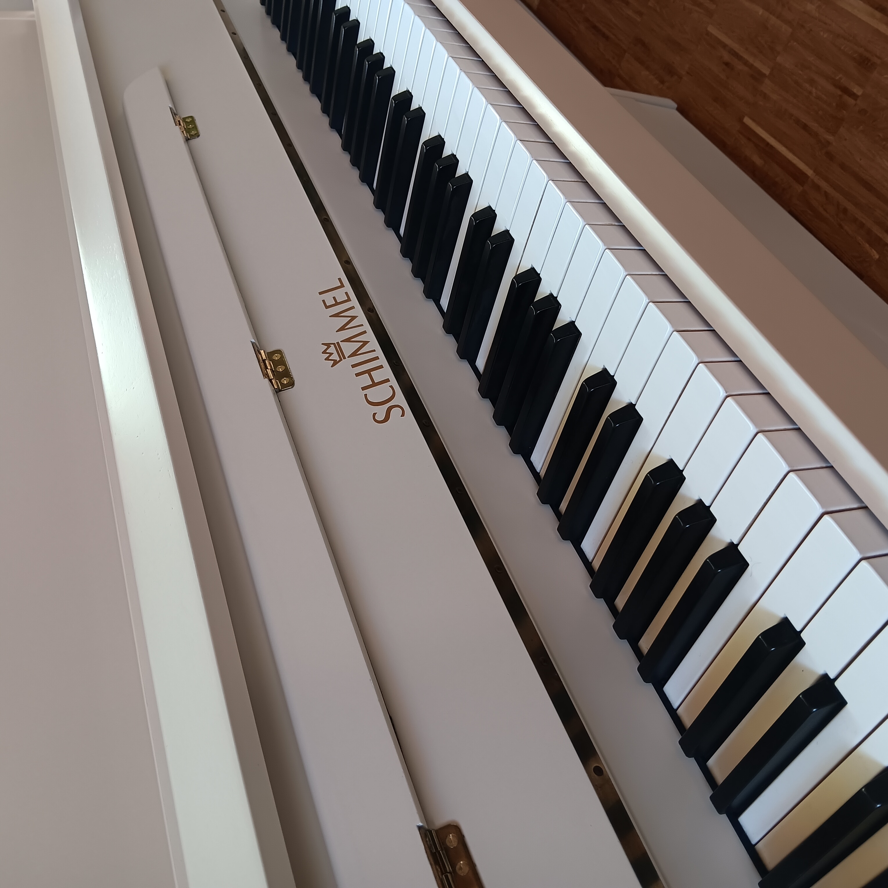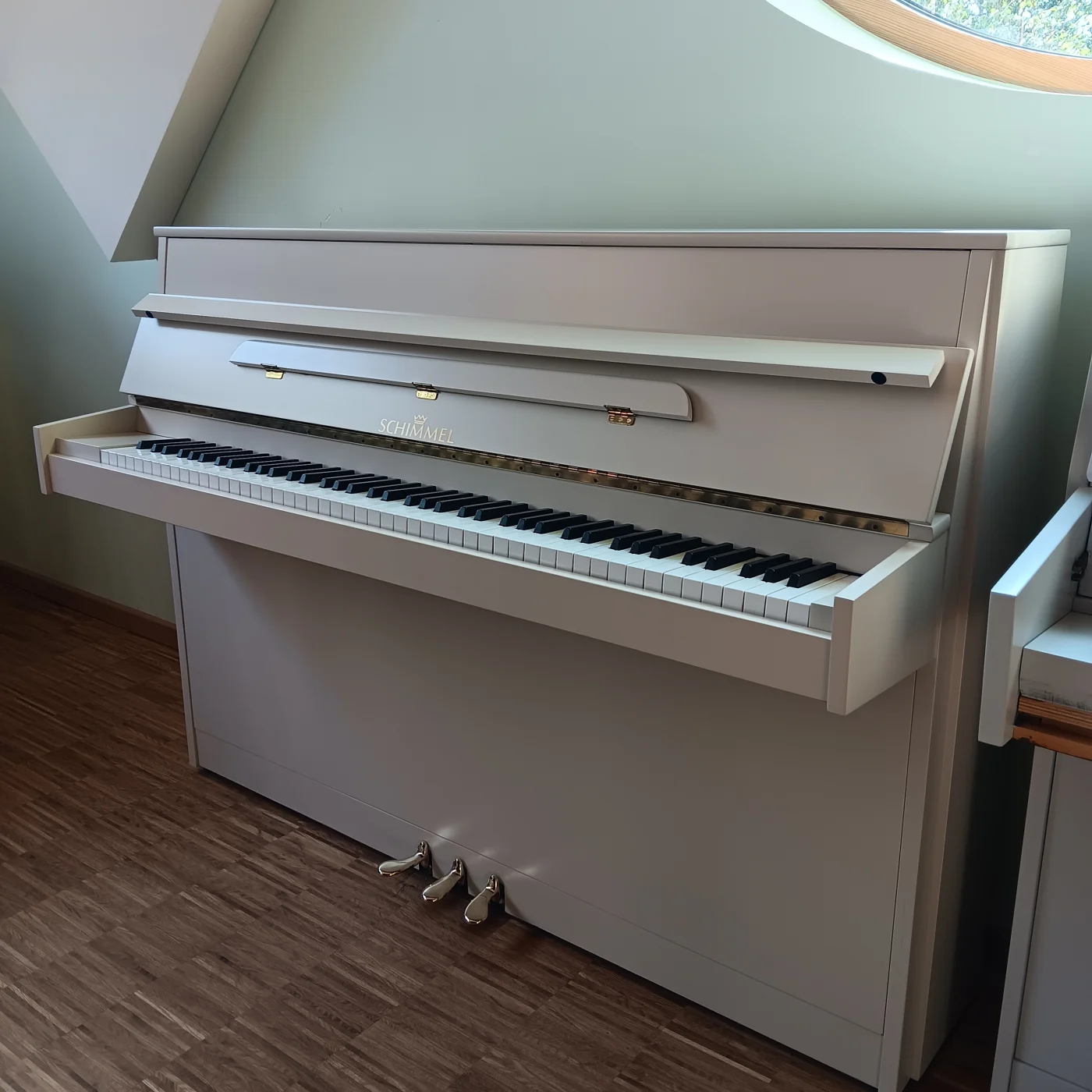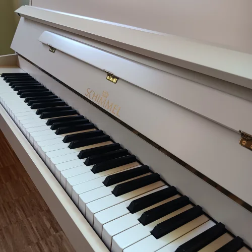 Anbieten möchten wir Ihnen ein überholtes Kleinklavier aus dem Hause Schimmel, neu lackiert in der "Wohlfühlfarbe" Farrow&Ball No.226 Joa's White.