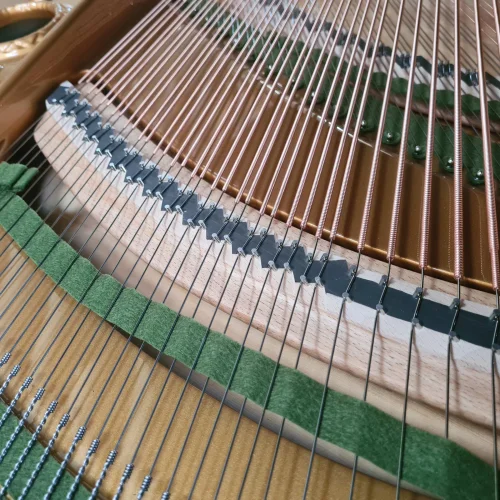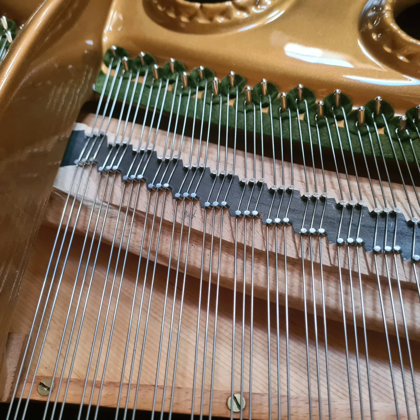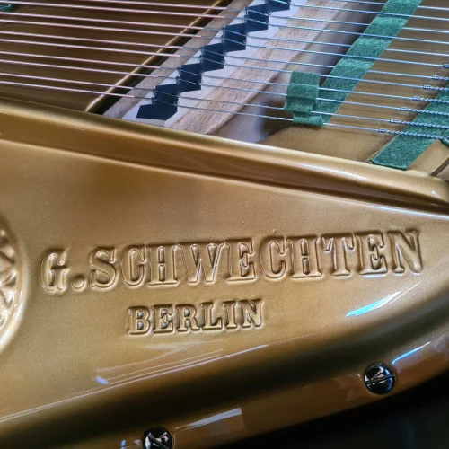 Schwechten ist ein Berliner Hersteller, die Fabik hat immerhin bis ca. 1953 insgesamt ca. 50.000 hochwertige Instrumente produziert. Auf vielfältige Weise wird deutlich, wie Qualität im Klavierbau gelebt wurde: augenfällig sind die stark frei über den Resonanzboden verbreiterten Stege aus erstklassig ausgesuchter Rotbuche; hier ergibt sich eine zweite Möglichkeit, Klang hörbar zu machen, in welcher der Steg selbst als Verstärker wirkt und nicht nur als Mittler zum Resonanzboden!