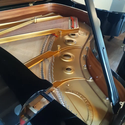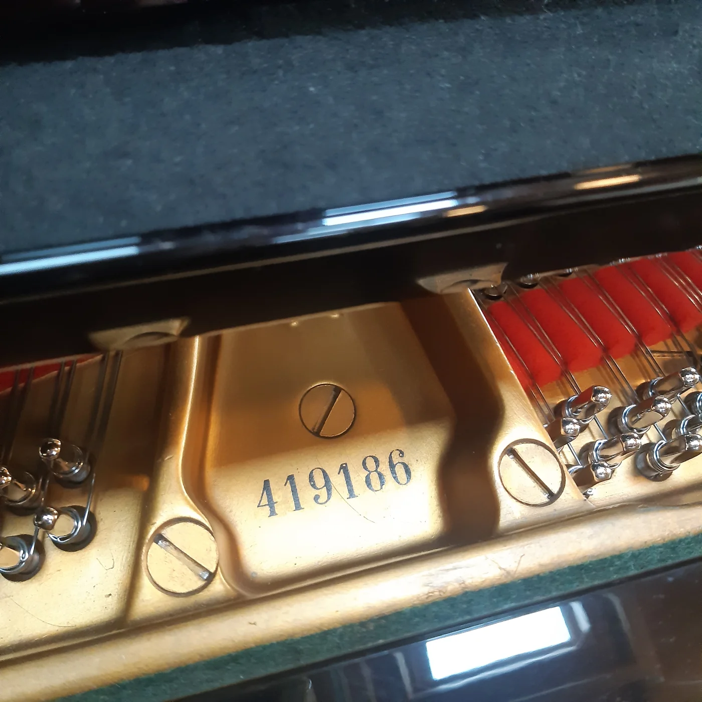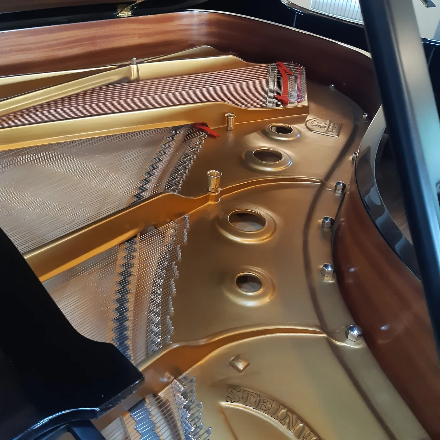 Vorstellen möchten wir Ihnen einen Steinway & Sons Modell A aus Hamburger Produktion. Dieser 1970 gebaute Flügel wurde in unserer Meisterwerkstatt generalüberholt und befindet sich in einem hervorragenden Zustand. Unseren Fachleuten war es wichtig, den reifen, zeittypyschen Klang excellenter Steinways dieser Zeit herauszuarbeiten. Dazu gehörte neben vielen anderen Arbeiten auch eine komplette Neubesaitung und -bewirbelung mit Erneuern der Saitenraumgarnierungen. Ein gutes Pfund Lack haben wir vom Resonanzboden geschliffen und diesen dünn neu lackiert, man hört deutlich, wie frei sich der Ton entfalten kann. Das Gehäuse wurde im Originallack belassen und in unserer Oberflächenabteilung maschinell aufgearbeitet, ebenso die Messingbeschläge und Rollen. Lediglich einige Anbauteile wurden neu lackiert.
