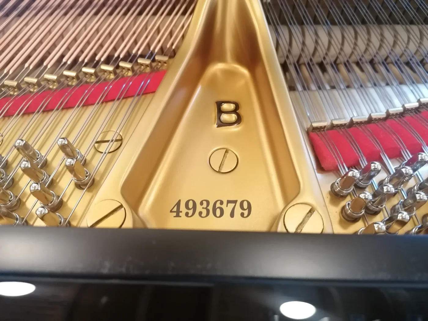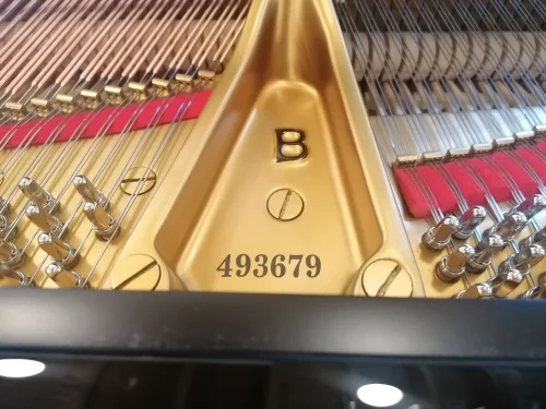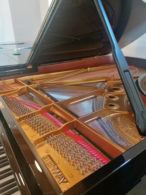 Gepflegter Steinway B in schwarz poliert aus Privatbesitz, der umfangreich in  unserer Meisterwerksatt generalüberholt wurde. Dieses sehr schöne Instrument wurde 1985 in Hamburg gebaut und erfuhr durch uns eine grundlegende und umfassende Generalreparatur. Neu aufgebaut wurde die Oberfläche in Polyester schwarz poliert in ausgezeichneter Qualität. Ebenfalls wurde die Gussplatte sandgestrahlt, gefüllert, neu lackiert und liniert. Der Resonanzboden, die Stege und der Stimmstock sind rissfrei und in ausgezeichnetem und unversehrtem Zustand. Die Klaviatur wurde mit Isoplast neu belegt, da Instrumente mit dem originalen Tastenbelag aus dieser Bauperiode nicht mehr gehandelt werden dürfen. Die Tastenpatien wurden bei dieser Gelegenheit seitlich angeleimt und die Klaviatur komplett neu garniert. Die Hammerköpfe wurden bereits einmal erneuert, nach dem vorsichtigen Abziehen erreichten wir eine Filzstärke, die in etwa einem neuen Hammersatz aus Hamburg entspricht. Erneuert wurden auch die Hammerrollen in Synthetic-Leder, wie es heute im Neubau üblich ist.
