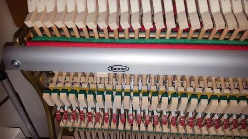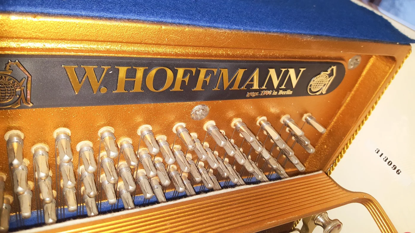 Große Mechanikinspektion durchgeführt, Gehäuse von unseren Oberflächenspezialisten maschinell aufbereitet mit Politur aller Messingteile, weicher, sehr voller Ton: es gibt Liebhaber, die sagen, dass Hoffmann nie besser klang als in der Zeit, als die Instrumente noch bei PETROF gebaut wurden....