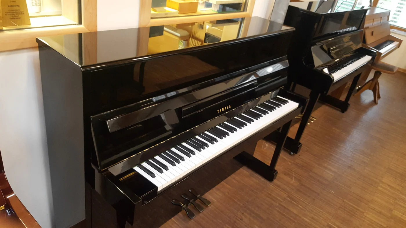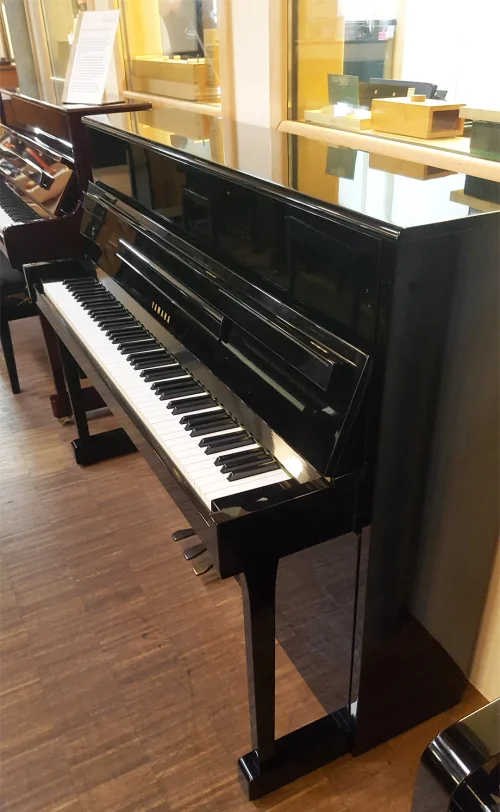 Schönes Konsolenmodell mit 114 cm Bauhöhe. Knackige Spielart, großes dynamisches Spektrum. Erstaunlich: auch Yamaha hatte rastenlose Konstruktionen, diese hier ist schlank und natürlich trotzdem genauso stabil wie ein Rasteninstrument. Schimmel hat´s vorgemacht!