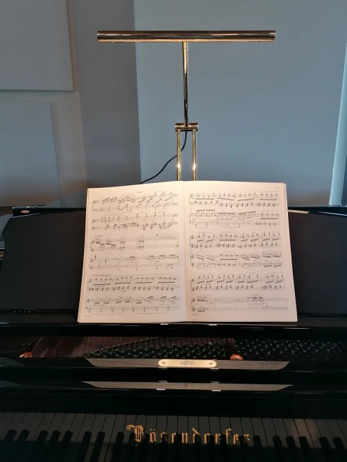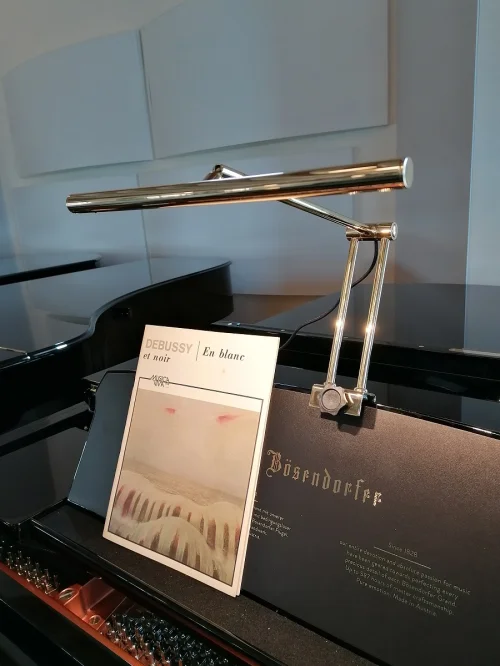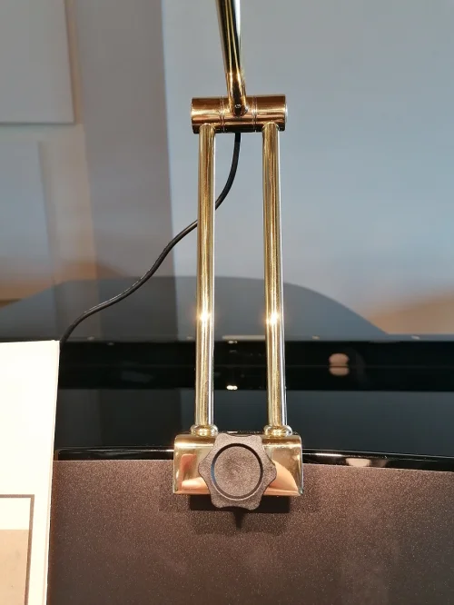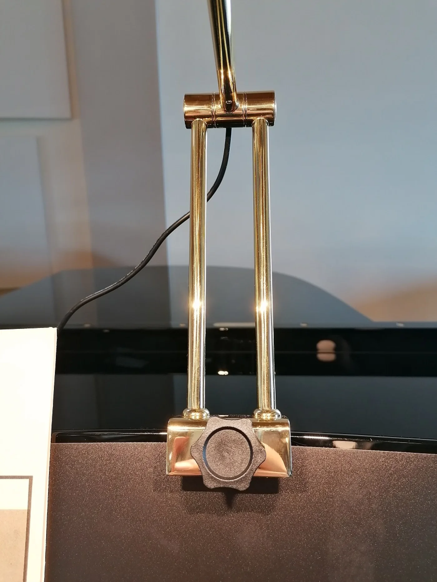 Aus dem Sauerland kommt auch diese Flügelleuchte, die bei Schmidt exclusiv für das Haus der Klaviere gefertigt wird. In den Farben Messing poliert und schwarz mattiert ist diese sehr hochwertige Leuchte erhältlich. Die 2x 3,2 watt LED Leuchtmittel strahlen in warmer Lichtfarbe über die gesamte Notenpultbreite und darüber hinaus. Der Klemmfuß ist in sehr stabiler Ausführung gehalten und beschädigt keinesfalls das Notenpult. Der Doppelsteg im unteren Lampenteil ist nicht nur vom Design ein Knüller: er ist auch viel stabiler als ein einfaches Rohr. Diese Leuchte ist wohlproportioniert, handwerklich bestens verarbeitet und setzt jeden Flügel ins beste Licht, sei es als Arbeitsplatz oder einfach nur, um das Lieblingsinstrument schön aussehen zu lassen. Die 6,4 Watt LED erhellen den entsprechenden Zimmerteil beachtlich und können an anderer Stelle eingespart werden.