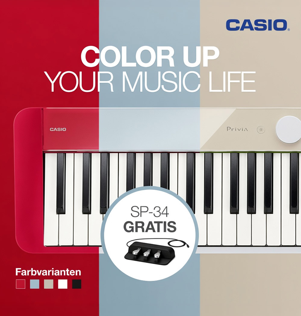 Der Frühling wird musikalisch! Ab dem 12. März 2026 startet die exklusive Casio „Color Up Your Music Life“ Aktion. Wer sich für das extrem kompakte und stylische Digitalpiano Casio Privia PX-S1100 entscheidet, profitiert in diesem Zeitraum von einem besonderen Bonus: Wir schenken Ihnen die passende 3-fach Pedaleinheit SP-34 im Wert von 69 € dazu!