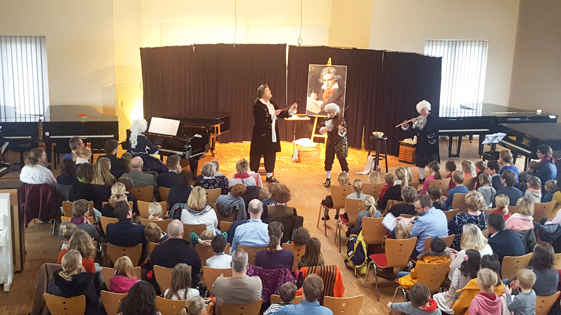 Gleich zweimal wurde am Wochenende zum Konzert geladen: am Samstag Abend zu Brahms für Erwachsene, am Sonntag um 11 für kleine Musikliebhaber - wobei das Haus mit wiederum 130 Gästen gut gefüllt war. Beethoven - dieser zweifellos sperrige Charakter wurde für Kinder mit schönen Kostümen und einer nett erzählten Geschichte erlebbar, in der die Klavierschülerin Elise, der Erfinder Mälzel und der Musikerfreund Schuppanzigh für verschiedene Themen aus Beethovens Leben standen. Den Zuhörern, die fleißig mitgemacht haben, hat es gefallen!