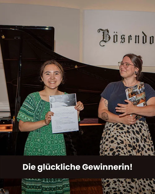 Die 15-jährige Clara Rosenfeldt wurde vom Publikum zur Gewinnerin gekürt, und darf sich nun auf ein Wochenende auf Kosten der Firma Bösendorfer in Wien, samt Werksführung und Hotelübernachtung freuen! Wir gratulieren herzlich und wünschen viel Freude.