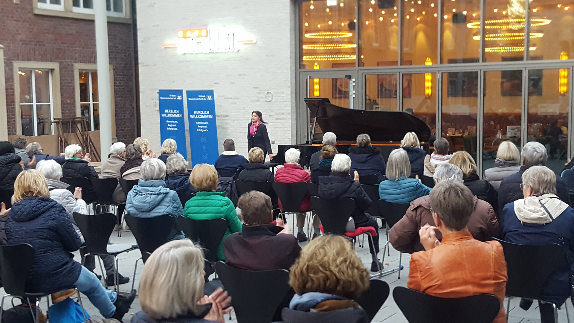 Das erste Klavierkonzert im EinsA fand am 4.10. mit der Pianistin Heidrun Holtmann im überdachten Atrium des EinsA statt, drei Beethoven-Sonaten erklangen auf unserem Bösendorfer Imperial, der bei grenzwertigen 13 Grad Aussentemparatur eine besonders aufmerksame Betreuung verlangte. Und: es war richtig gut! Heidrun Holtmann fand sich in Tempowahl und Dynamik hervorragend in die ungewöhnlichen akustischen Verhältnisse, und der bei Open Air-Konzerten zu befürchtende Effekt des „sich verflüchtigenden Klangs“ blieb durch das Glasdach aus. Im Gegenteil: auch leiseste Passagen waren dank der Tragfähigkeit des Bösendorfers und der klugen Pianistik bis in die letzte Reihe verständlich, und das Prestissimo im Schlusssatz der Appassionata überschlug sich nicht etwa, sondern blieb immer durchhörbar. Dülmen hat einen neuen Konzertsaal!