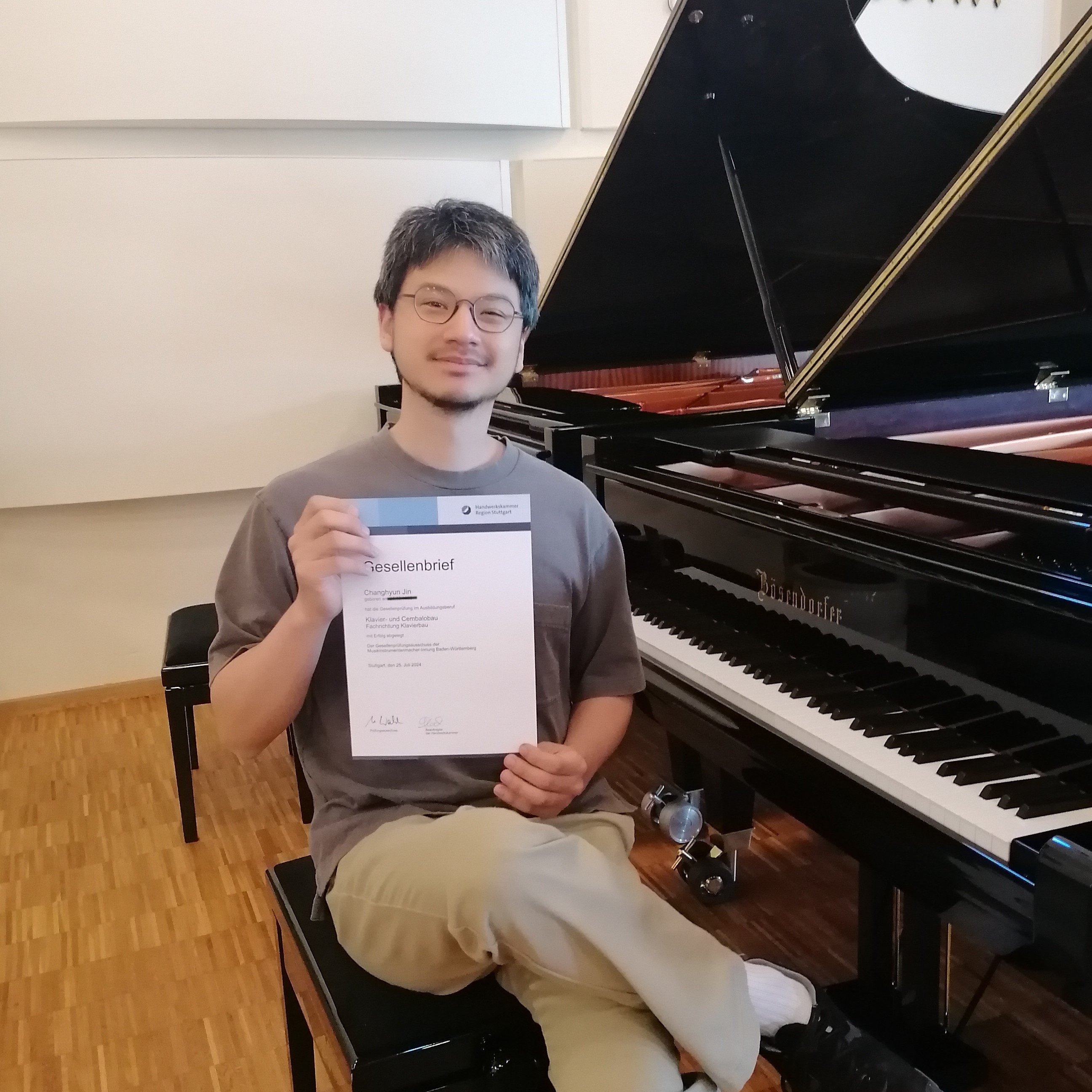 Am 25.07.24 absolvierte Changhyun Jin erfolgreich seine Gesellenprüfung zum Klavier-und Cembalobauer. Wir freuen uns sehr, dass er auch zukünftig unser Team tatkräftig unterstützen wird.