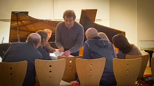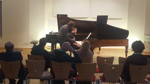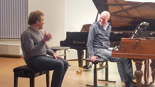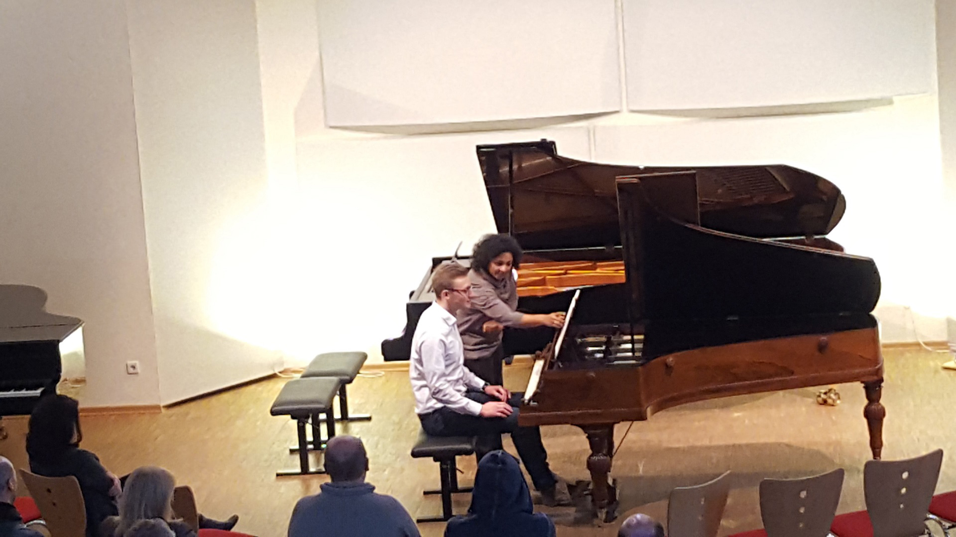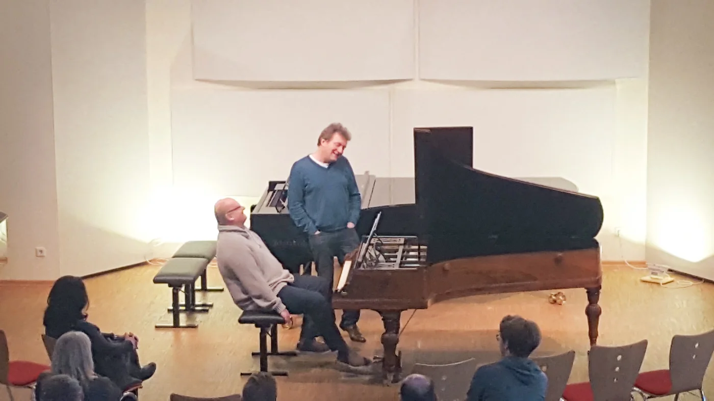 Aber dieser Aspekt war nur der kleinste Teil, der für die insgesamt 9 aktiven Teilnehmer den Unterschied zum modernen Instrument ausmachte, welches natürlich ebenfalls als Unterrichtsinstrument genutzt wurde: die Direktheit der Tonformung durch den Finger, die Transparenz des Klangbildes und die unterschiedlichen Register, die der Flügel im Unterschied zum modernen Instrument geradezu kultiviert, all dies lädt dazu ein, Chopin neu zu erleben und diese Erkenntnisse durchaus auf den modernen Flügel zu übertragen.