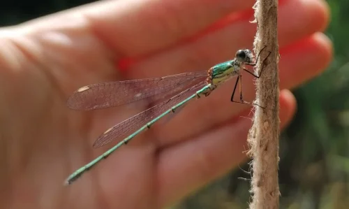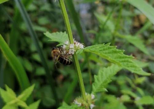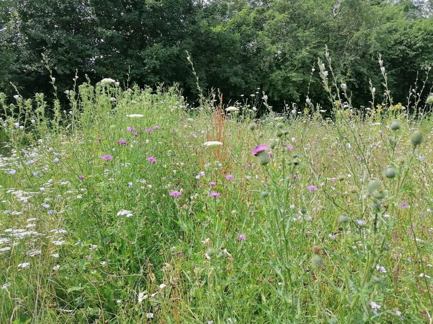 Der Garten hinter dem HdK wurde in Zusammenarbeít mit Dr. Detlev Kröger im Frühjahr 2020 umgestaltet. Die Wiese wurde mit der Fräse teilweise von der Grasnarbe befreit und eine speziell zusammengestellte heimische Wildblumen und –kräutermischung ausgesät. Bereits im 2. Jahr zeigt sich ein beeindruckende Vielfalt heimischer und für Insekten wertvoller Pflanzen: verschiedene Klee-Arten wie z.B. Inkarnat- oder Wiesen-Klee, Rote und Weiße Lichtnelke, Moschus-Malve, Wegwarte und Wiesen-Flockenblume, um nur einige zu nennen. Über schmackhafte und gesunde Beikräuter wie Spitz- und Breitwegerich, Wiesen-Schafgarbe oder Gundermann freuen sich nicht nur Insekten, sondern auch Familie und Team. Verschiedene Libellenarten, Frösche und Molche tummeln sich im Gartenteich, den es schon seit vielen Jahren gibt, umrahmt von Weidenröschen, Sauergräsern und Binsen. Kohlmeisen brüten in den Vogelhäuschen, und ein Grünspecht-Pärchen ist seit einigen Jahren immer wieder zu Gast.