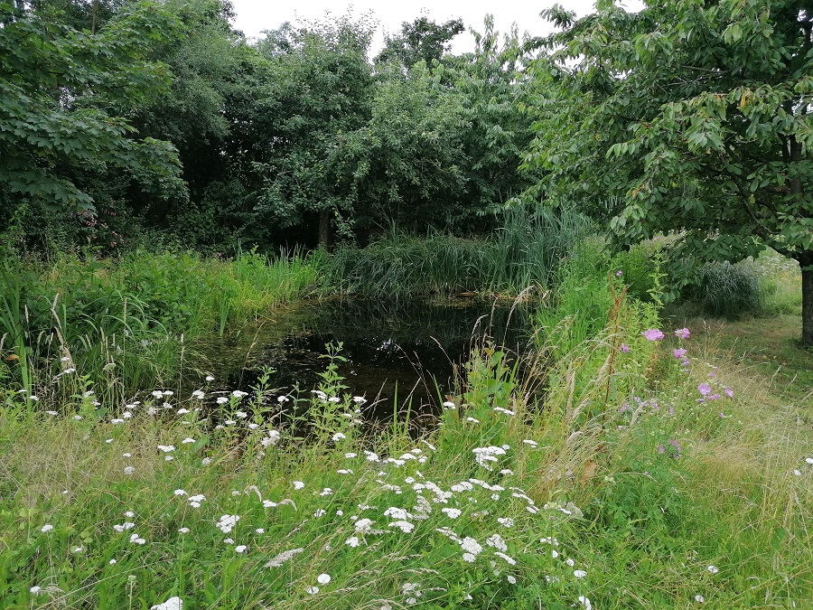 Die Wiese wird nur im Herbst einmal gemäht. Der Teich, verwilderte Ecken, Totholz, Steinhaufen, viele Bäume und die große Wildgehölzhecke bilden Brut- und Überwinterungsmöglichkeiten sowie ein gutes Nahrungsangebot übers ganze Jahr.