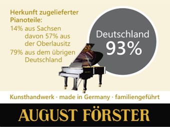 Seit 2008 führt Annekatrin Förster die Pianomanufaktur in fünfter Generation. Die Mitarbeiter halten die Tradition des kunsthandwerklichen Klavierbaus hoch – und bekommen die Qualität ihrer Arbeit nicht nur von ungezählten zufriedenen Kunden, sondern auch von ausgewiesenen Experten bestätigt. So haben erstklassige Pianisten im Auftrag der Hamburger Elbphilharmonie die Qualität der Löbauer Instrumente als sehr gut bewertet. Heute ist die Art und Weise der Produktion von August Förster mehr und mehr eine Besonderheit. Auch in der Klavierbaubranche werden immer mehr Tätigkeiten von Computern übernommen, Produktionsbereiche an Zulieferer ausgelagert. In Löbau bekennt sich die Unternehmensleitung zu den überlieferten handwerklichen Fähigkeiten. Versierte Fachleute fertigen Instrumente bis heute liebevoll in aufwendiger Handarbeit. In der Manufaktur werden zum Beispiel sämtliche Gehäuseteile hergestellt, Rasten gebaut, Basssaiten mit Kupfer umsponnen, die Instrumente vielfach gestimmt und sensibel intoniert. All dies führt zu einer sehr guten Stimmhaltung der Pianos. Hunderte Stunden sind nötig, um ein Instrument fertigzustellen. Eigene Konstruktionen, über Jahrzehnte weiterentwickelt, verleihen den Instrumenten den typischen August-Förster-Klang: warm, voluminös und gleichzeitig brillant in allen Tonlagen.