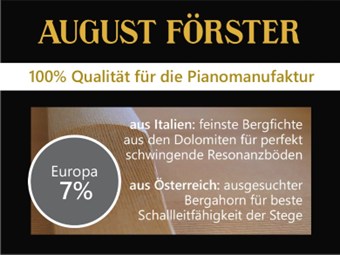 Der charakteristische warme, harmonische AUGUST FÖRSTER Klang und die voluminöse Tonentfaltung Instrumente sind Ergebnis von profunder Erfahrung, die in einem mehr als 160-jährigen kontinuierlichen Verbesserungsprozess erworben wurde. Ein besonders erwähnenswertes Resultat ist der mit großer Sorgfalt ausgestaltete Resonanzboden, der auf Försterart einmalig ist. Die starken Gussplatten der AUGUST FÖRSTER Klaviere und Flügel nehmen mühelos die Zuglast der Saiten auf (bis zu 20 Tonnen!). Obwohl die Spezialform – zurückgehend auf ein Patent von August Förster aus dem Jahre 1866 – weitestgehend Verwindungssteifheit garantiert, baut August Förster als kräftige Holzkonstruktion zusätzlich noch eine sehr solide Rast ein. Daraus ergibt sich die sprichwörtlich gute Stimmhaltung unserer Instrumente.