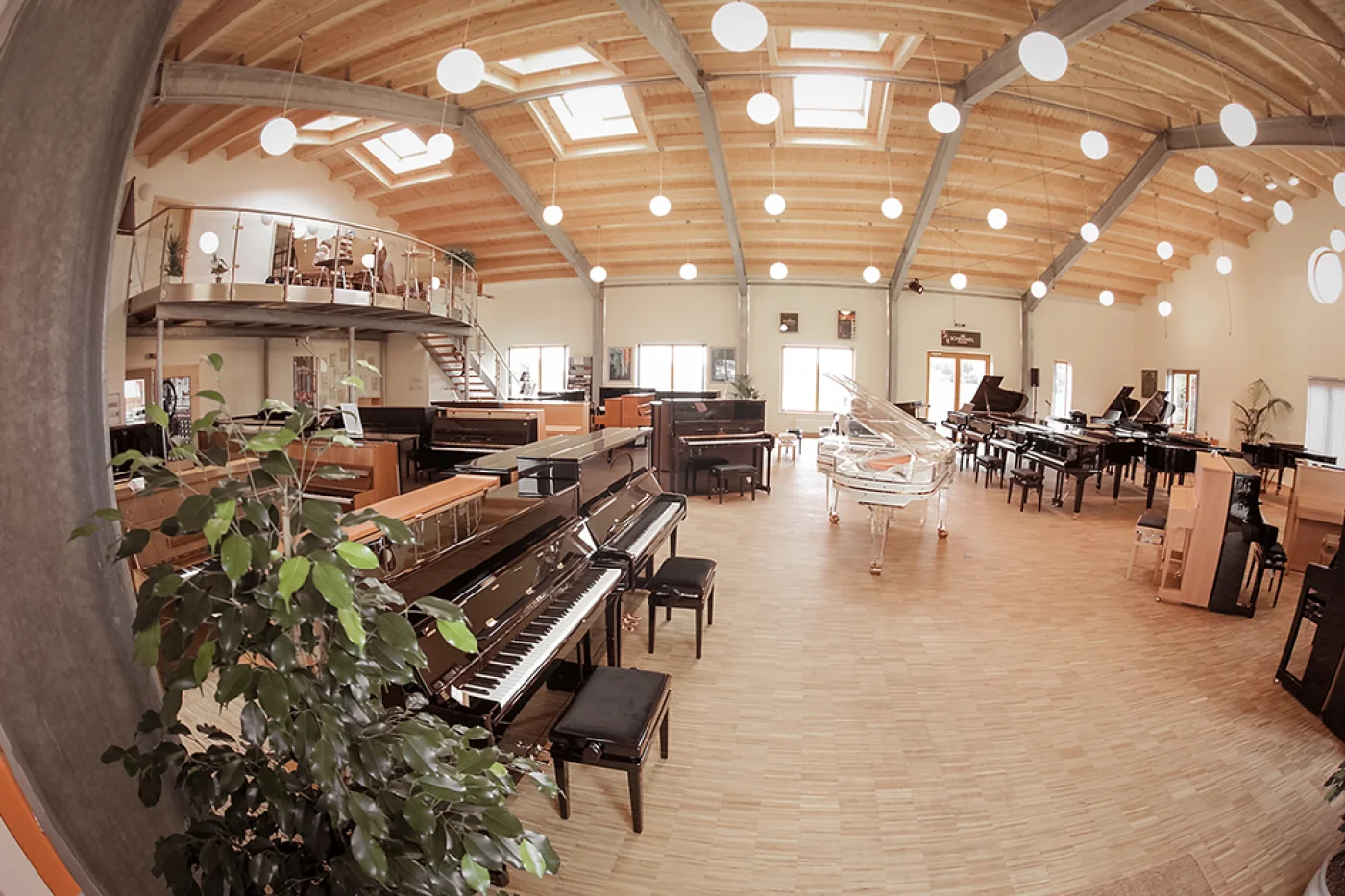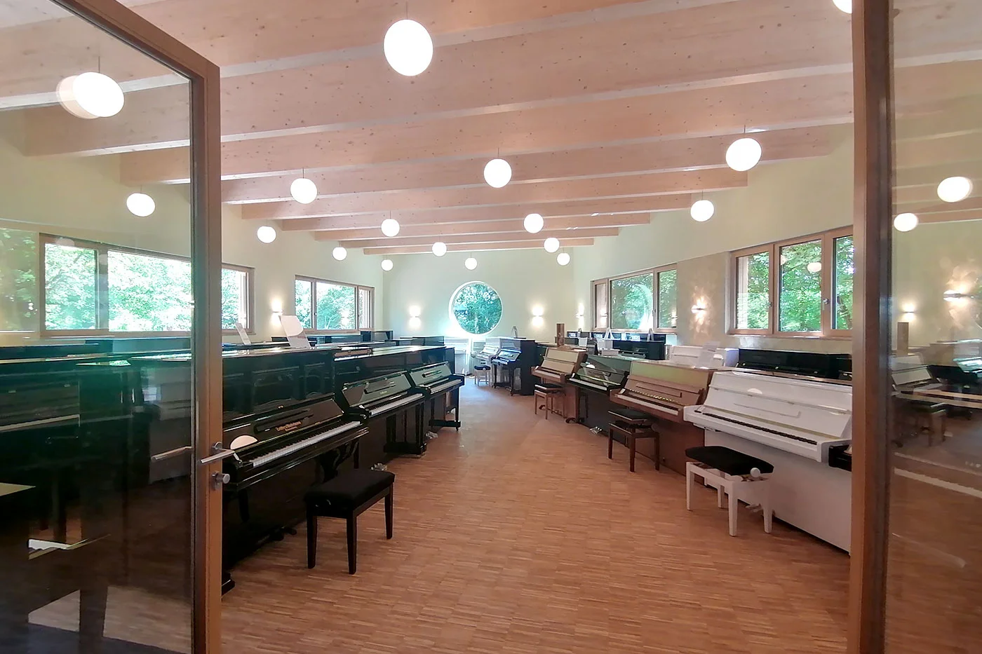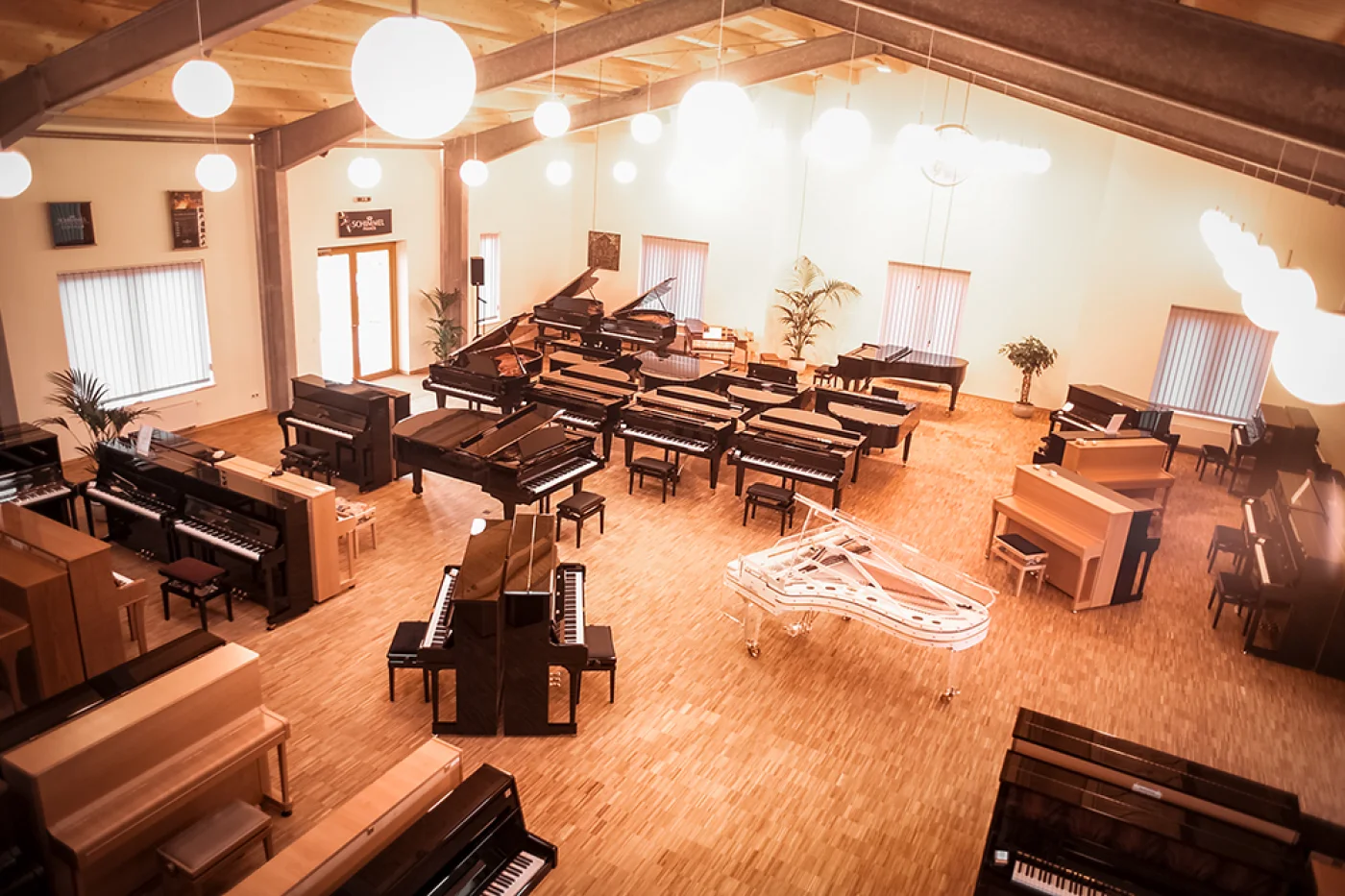 Im Flügelsaal stehen regelmäßig mindestens acht Bösendorfer-Modelle sowie acht generalüberholte Steinway & Sons-Flügel zum Anspielen bereit – ergänzt durch zahlreiche weitere Marken, die das Klangspektrum abrunden.