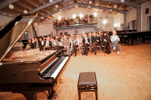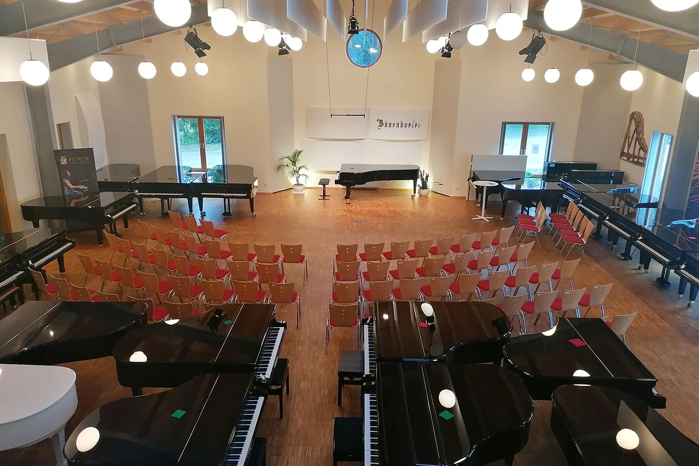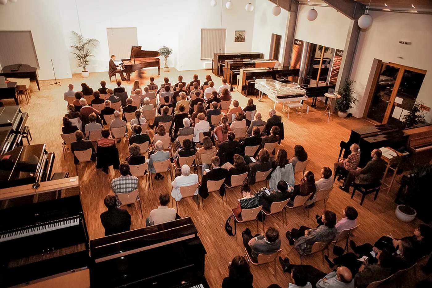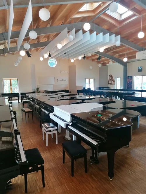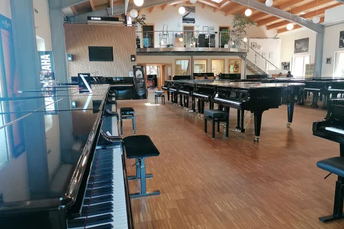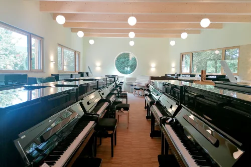 Im Flügelsaal stehen regelmäßig mindestens acht Bösendorfer-Modelle sowie acht generalüberholte Steinway & Sons-Flügel zum Anspielen bereit – ergänzt durch zahlreiche weitere Marken, die das Klangspektrum abrunden.