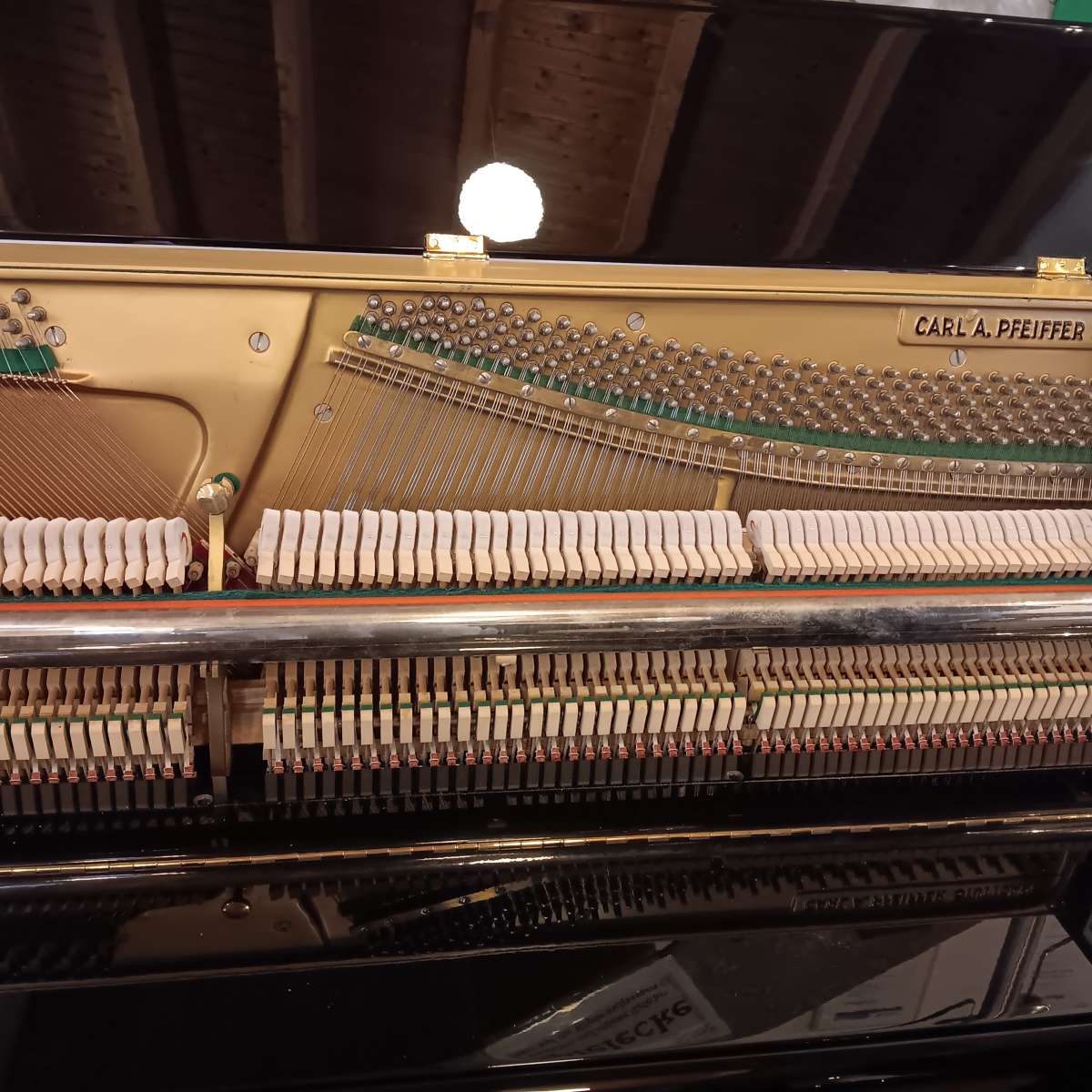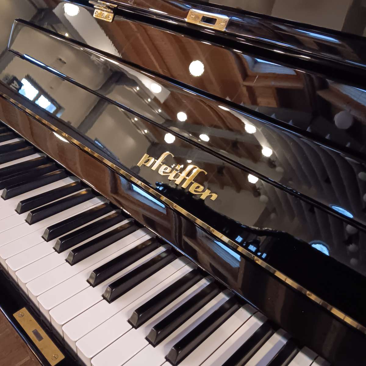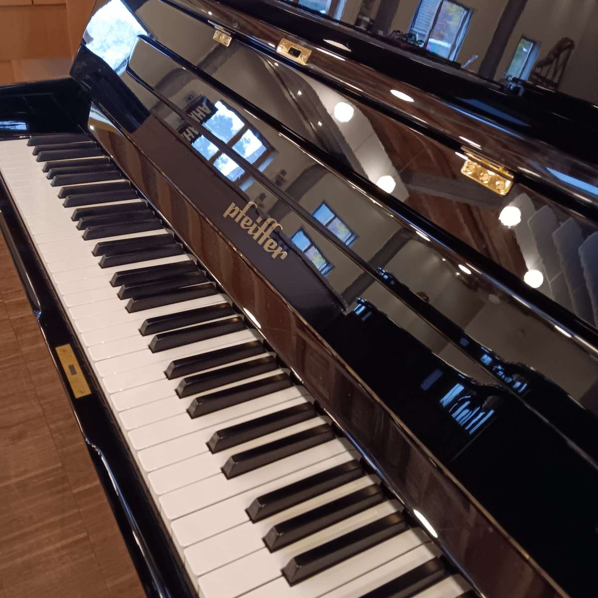Feines Pfeiffer-Klavier in schwarz poliert. In typischer Form der 60er und 70er Jahre wirkt das Gehäuse in seinem neu aufgebauten Polyesterlack in schwarz hochglänzend edel und zeitlos. Wenn dazu eine der besten Klavierkonstruktionen kommt, die unsere Branche kennt, ist das Gesamtbild stimmig. Unser Pfeiffer 112 cm erfuhr in unserer Meisterwerkstatt eine Generalüberholung mit Neubefilzen der Hammerköpfe, neuen Klaviaturgarnierungen und einer kompletten Ausarbeitung auf hohem Niveau.