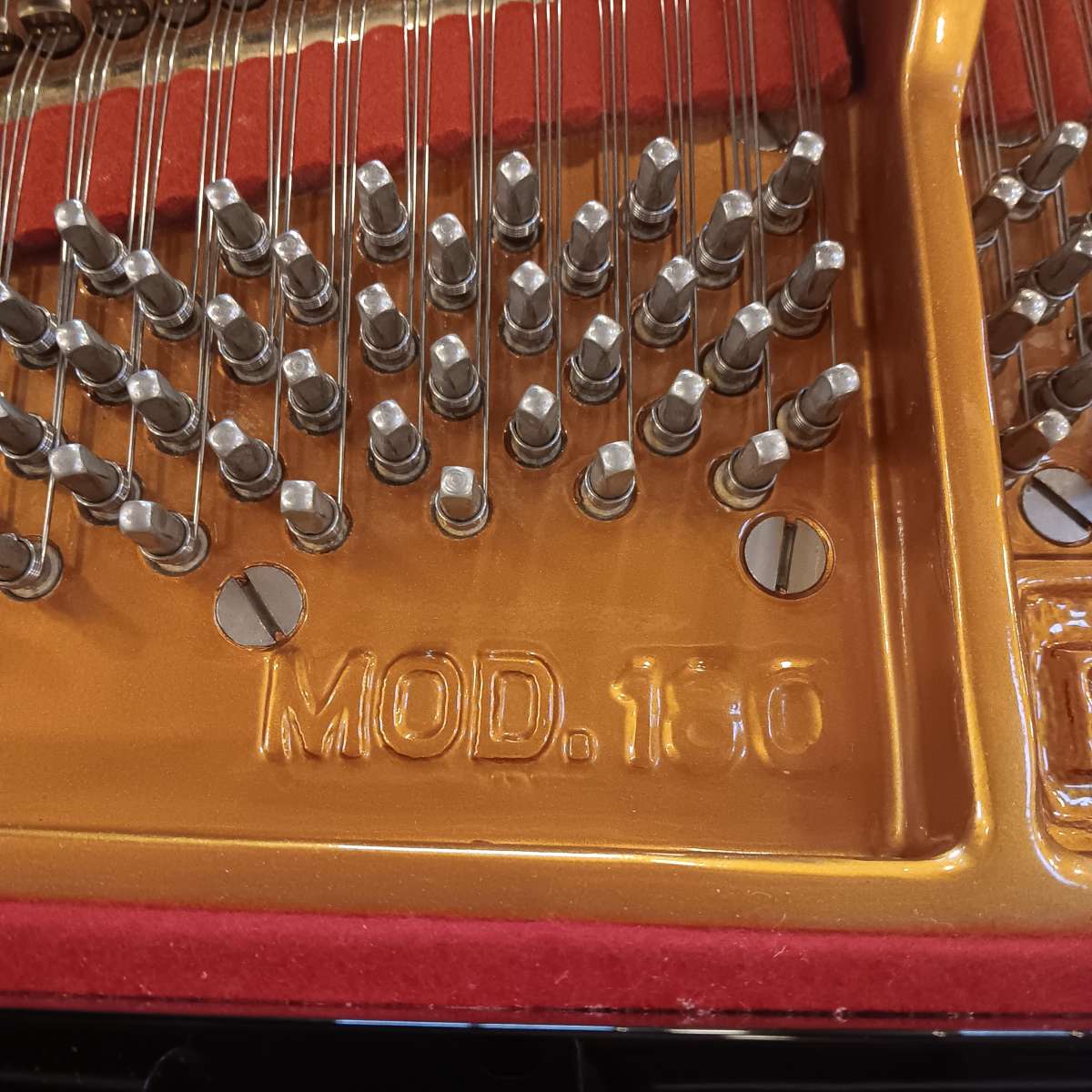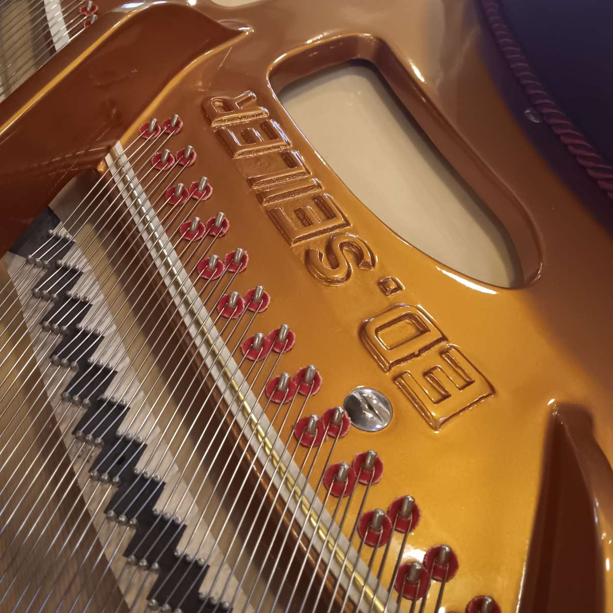 Dieser Seiler-Flügel von 1991 stammt aus einem kleinen Haushalt, in dem er kaum genutzt wurde. Tatsächlich ist das Gehäuse nahezu kratzerfrei (er wurde also auch nicht als Ablage benutzt), die Hämmer wiesen kaum sichtbare Einschläge auf. Made in Germany, Mechanik von RENNER, Hammerköpfe von Abel, das war damals Standard und ist auch noch heute gut, wenn der Rest stimmt. Und das tut er: Vollständig blanke Saiten, der Resonanzboden unversehrt mit dem patantierten Membrator-System. Darunter versteht man eine Fräsung am Rand neben dem Resonanzbodenlager (da, wo er aufgeleimt ist), die den Resonanzboden dort flexibler und damit schwingungsfähiger macht. Eine gute Idee, wie wir finden: sehr schönes Sustain, also langes Abklingverhalten belohnt.